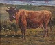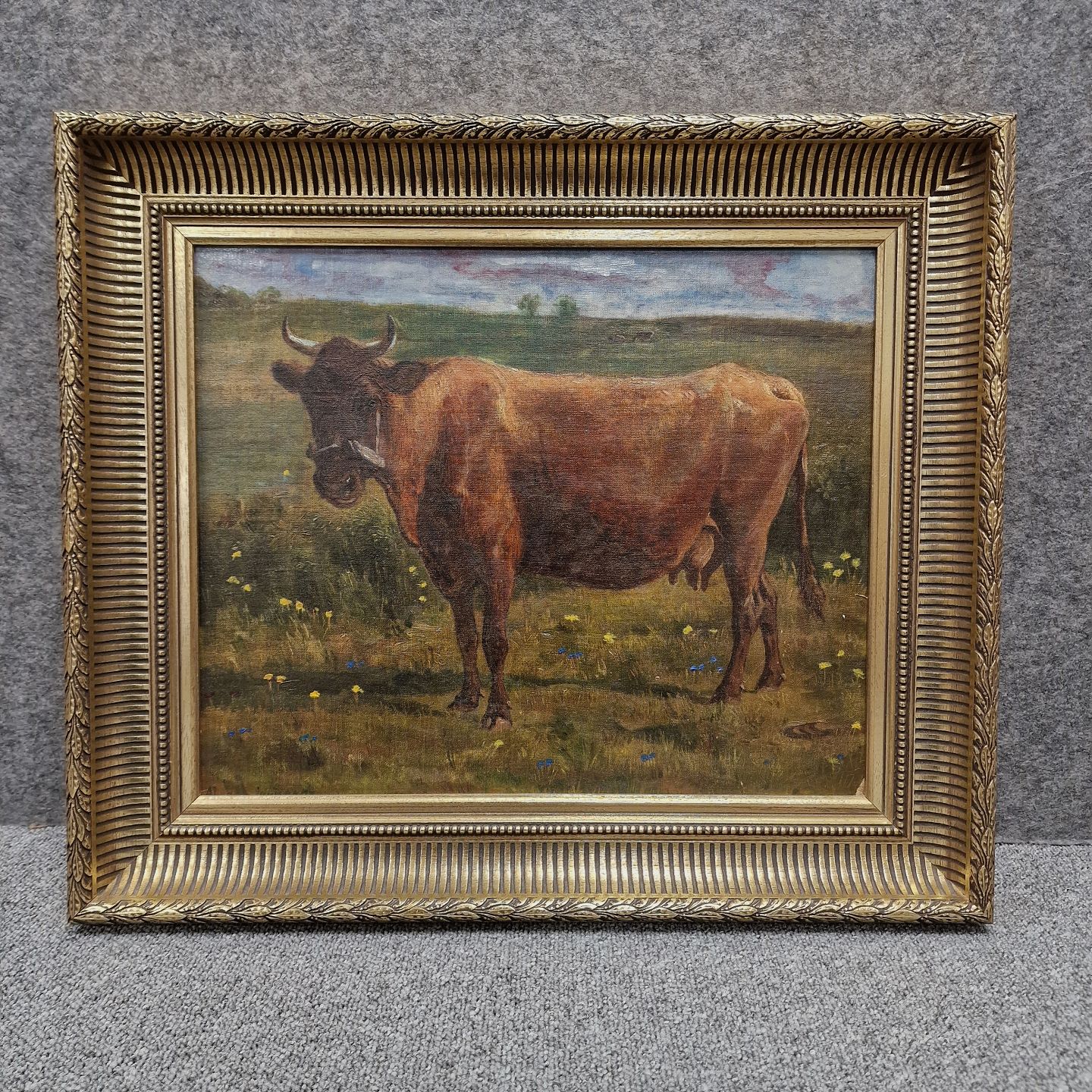 Maleri på plade med motiv af en Jersey ko. Dateret 1877