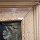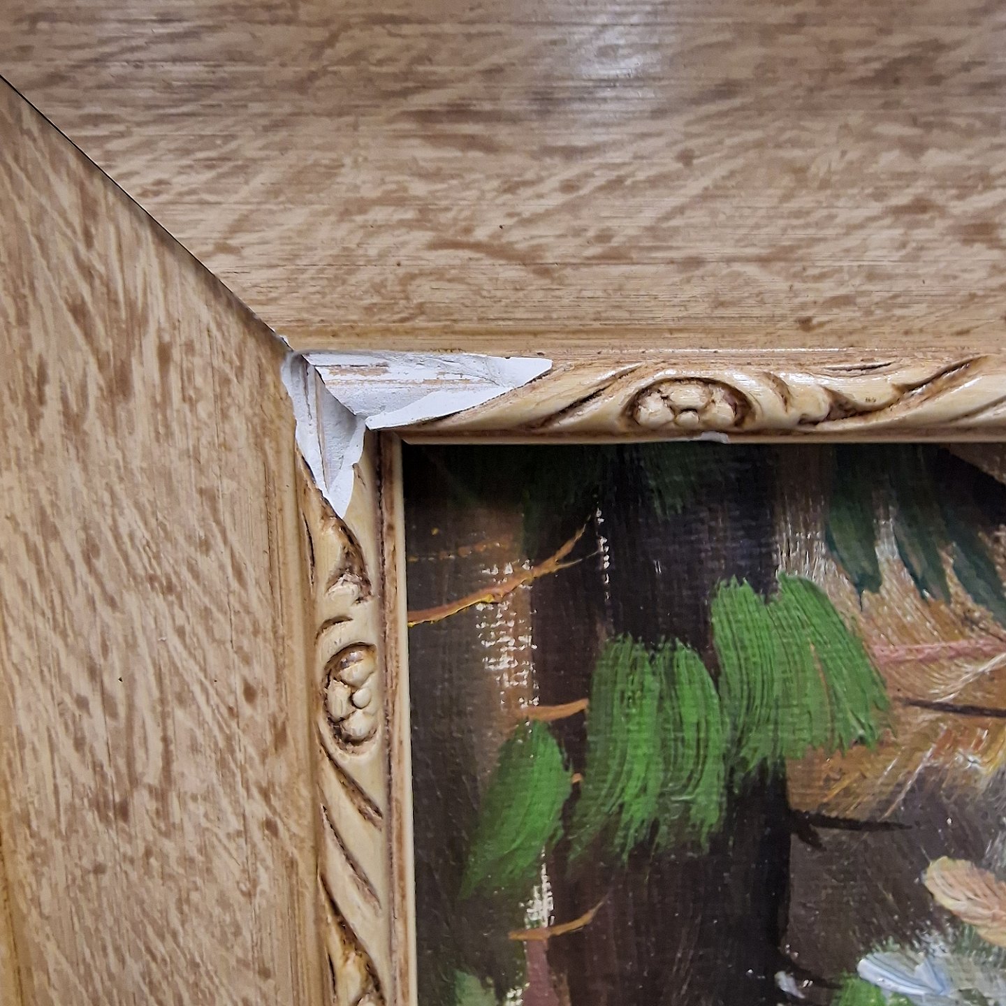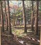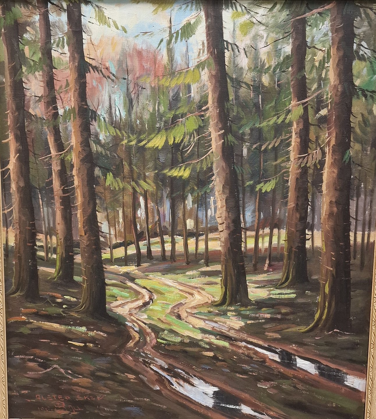 Oliemaling på lærred. Naturmaleri med motiv skovvej mellem høje grantræer