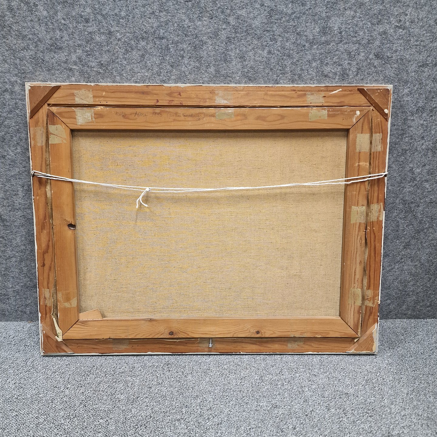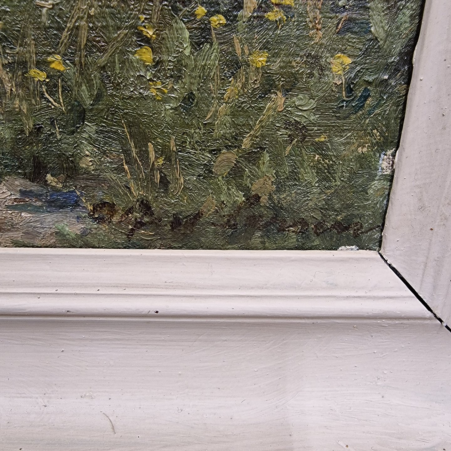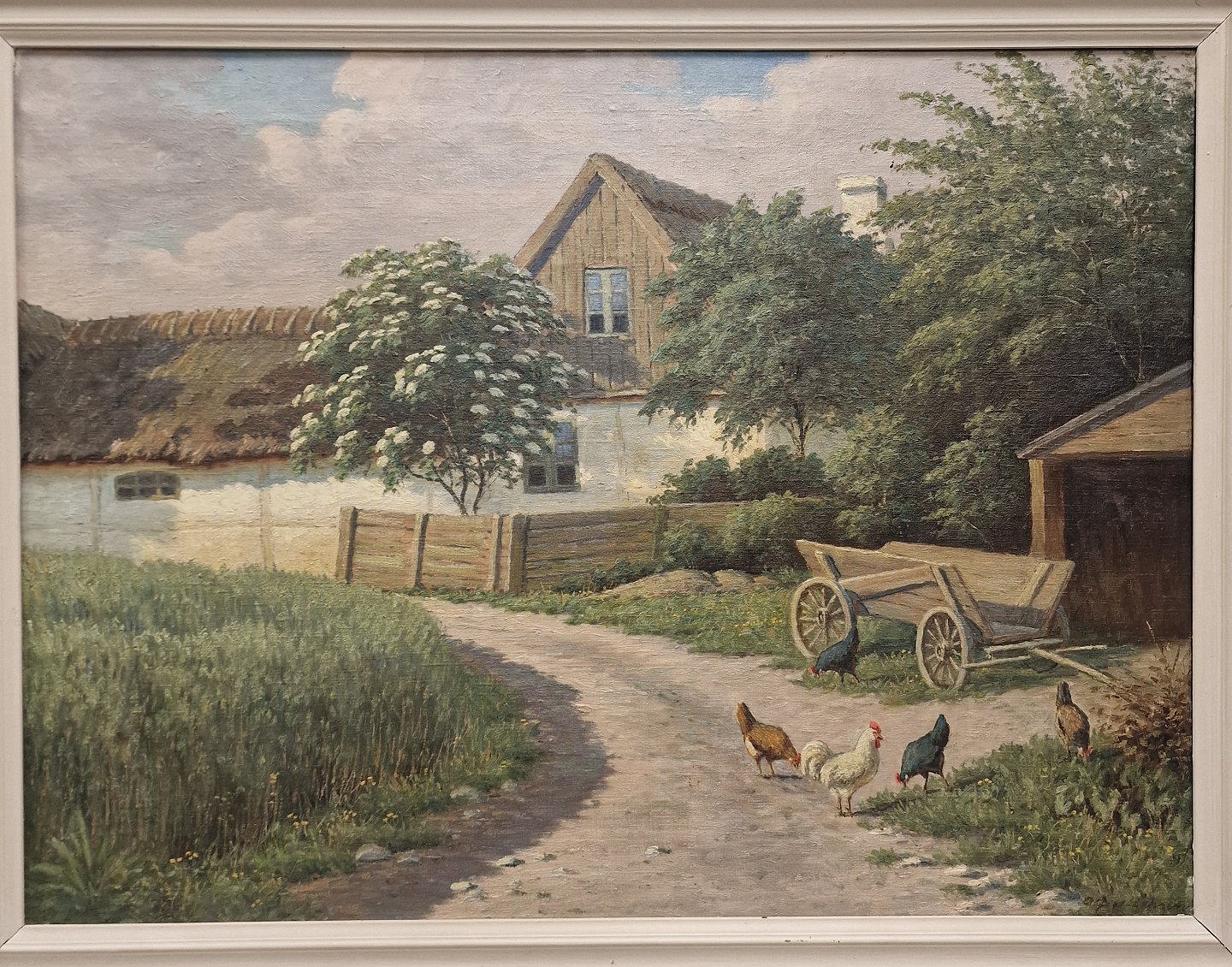 Oliealeri på lærred med idyllisk naturmotiv af høns ved stråtrægt bondegård