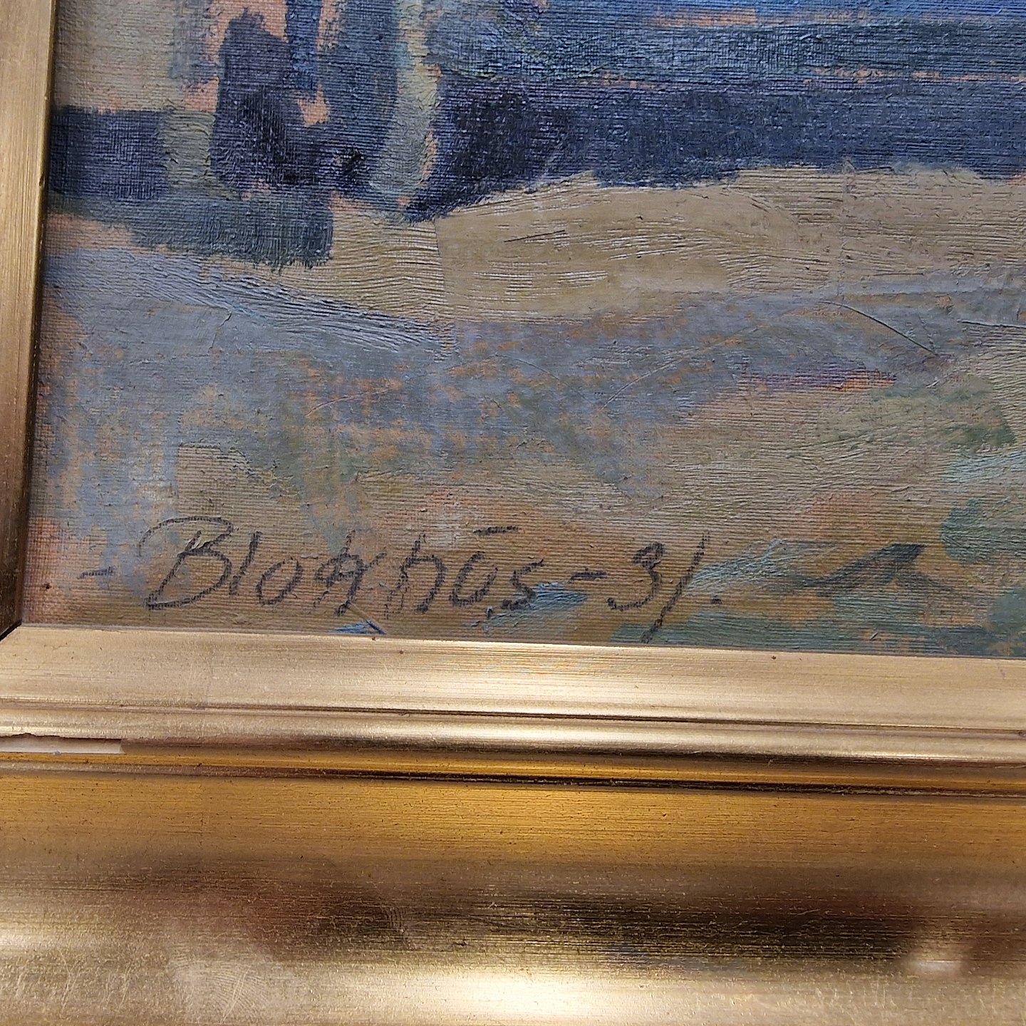 Oliemaleri på lærred. Naturmaleri med motiv af mennesker ved badehuse i Blokhus