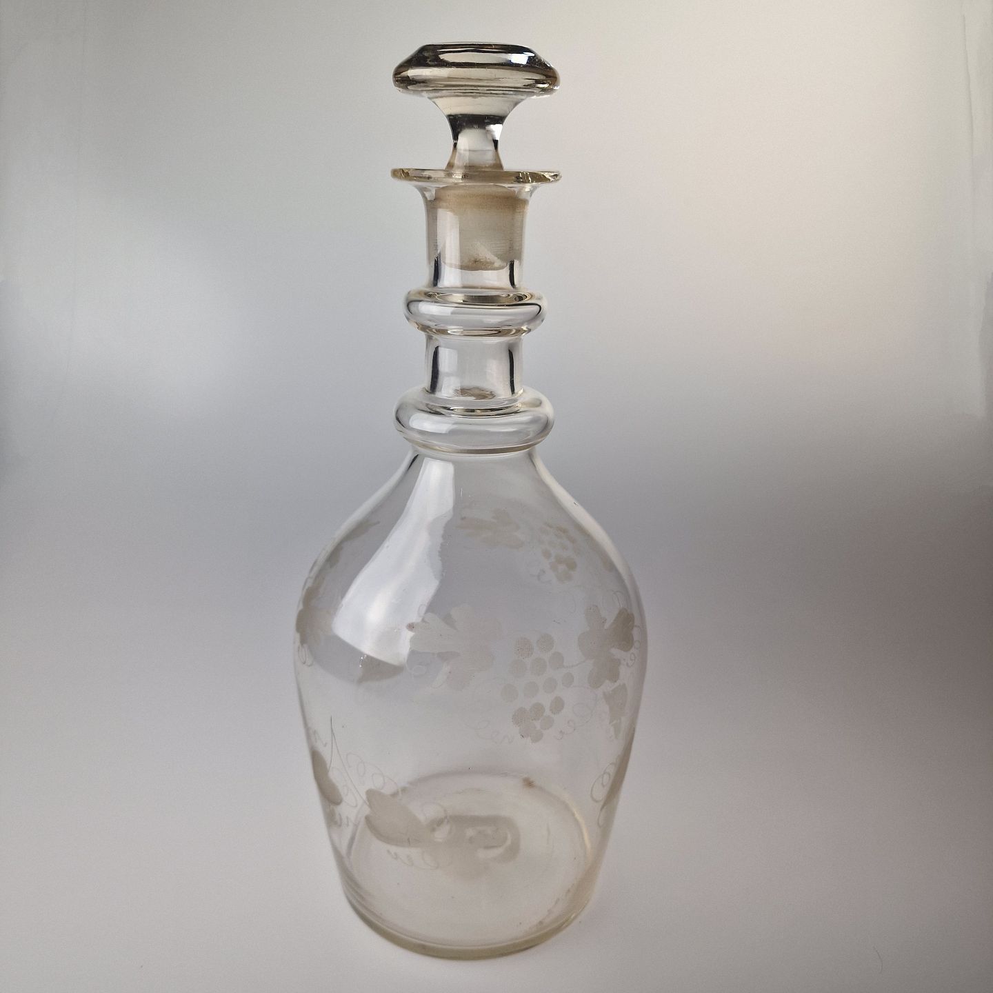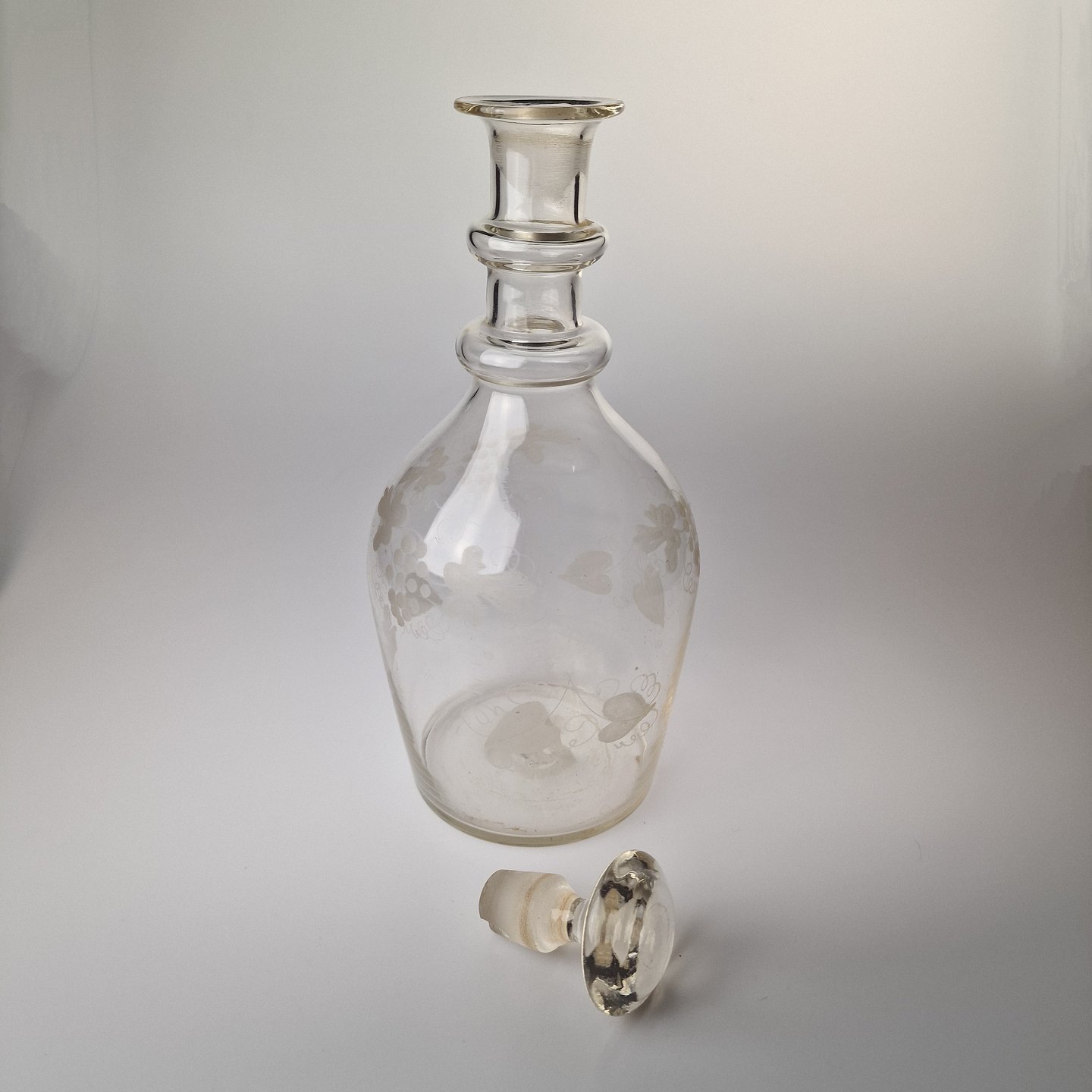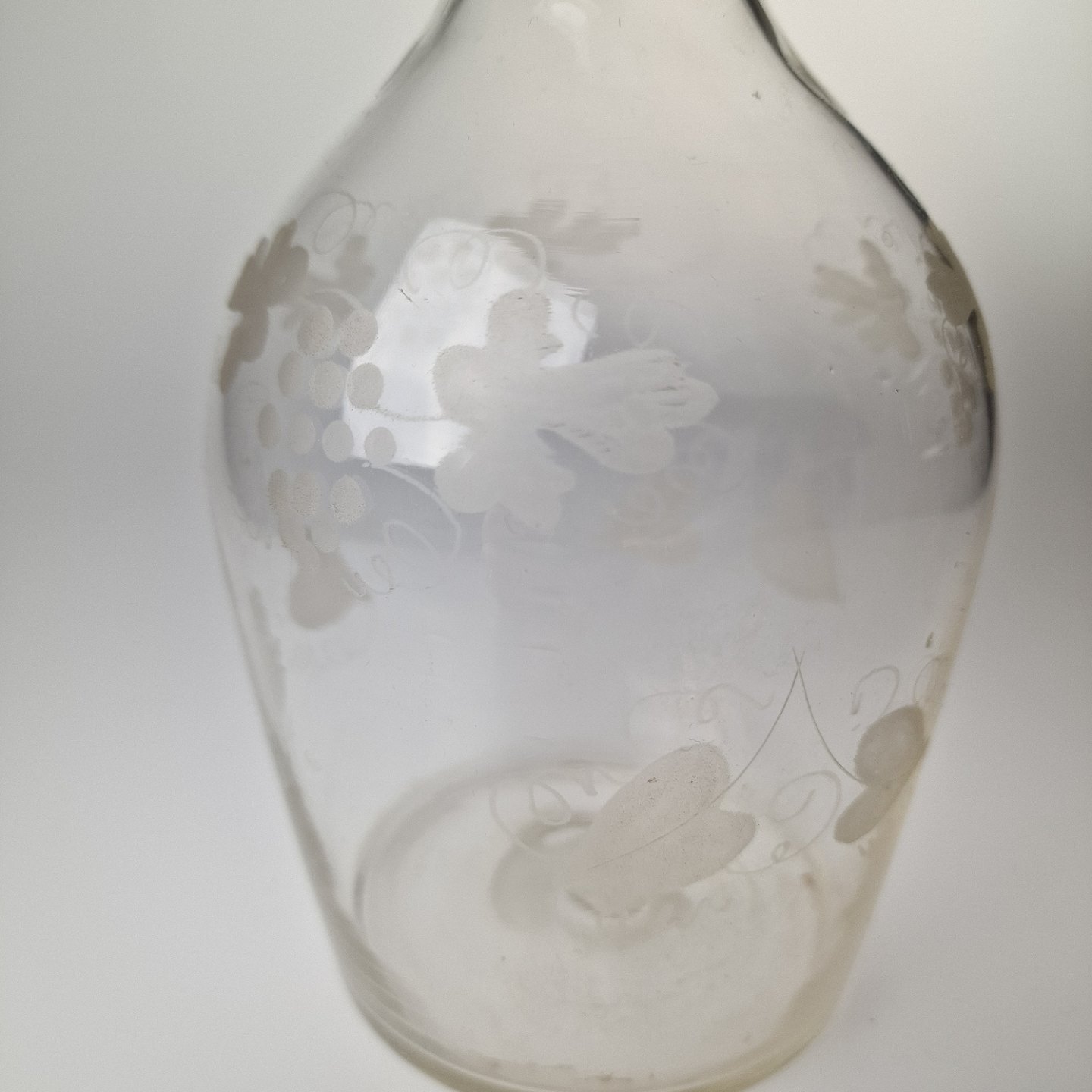 Klar glas karaffel dekoreret med vindrueranker, prop formentlig ikke den originale