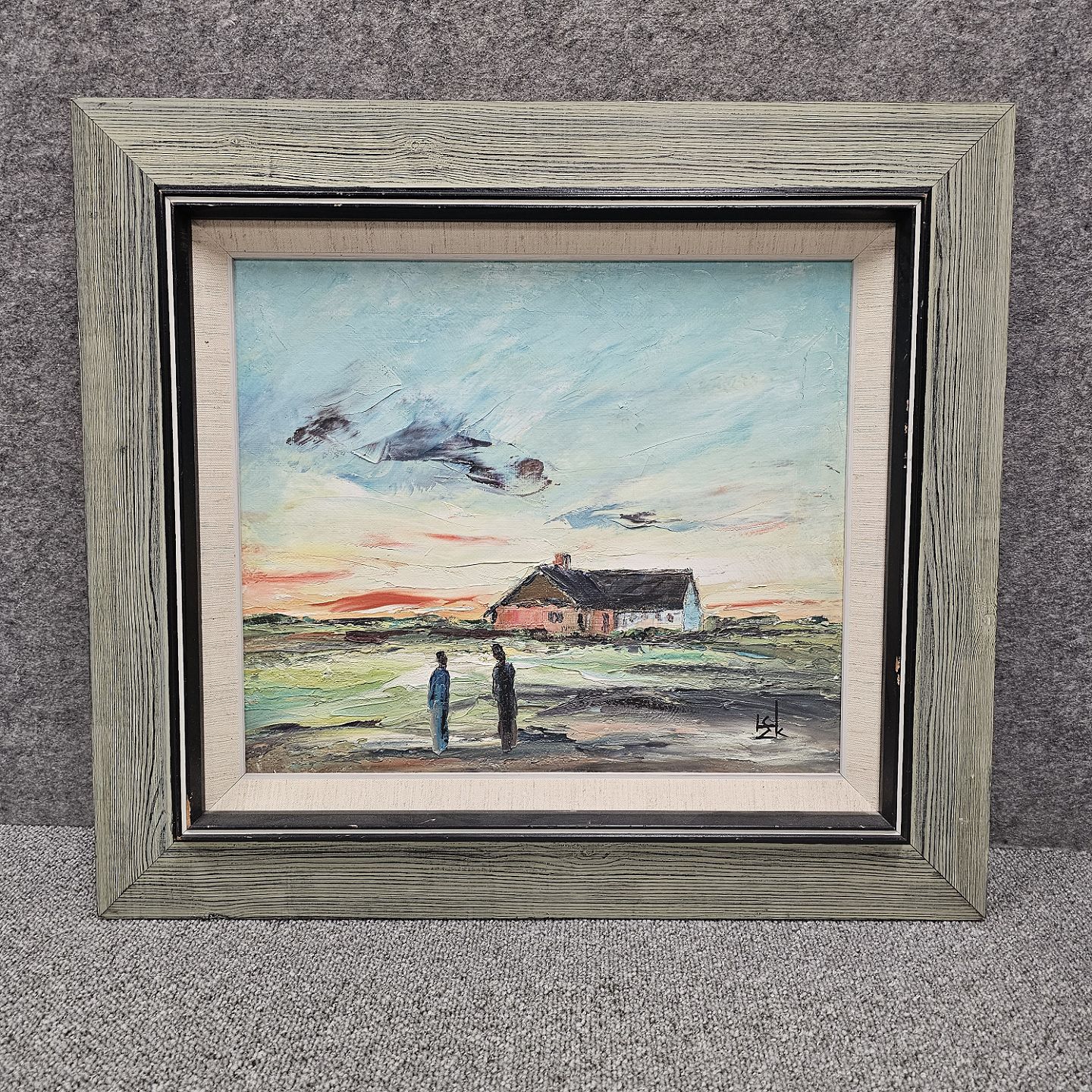 Maleri af oliemaling på lærred, med motiv 2 personer ved et hus