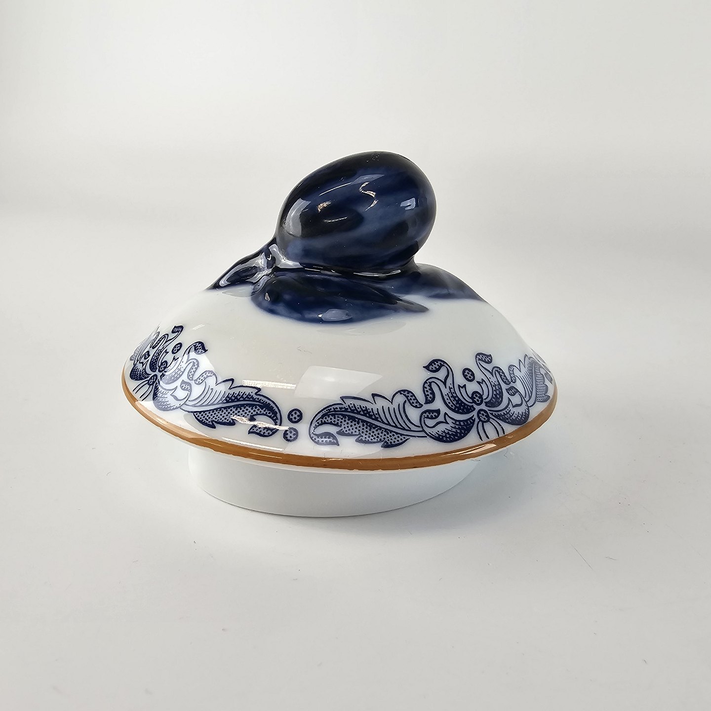 Hvidt porcelæn dekoreret med delikate blå blomster og mønster med blade