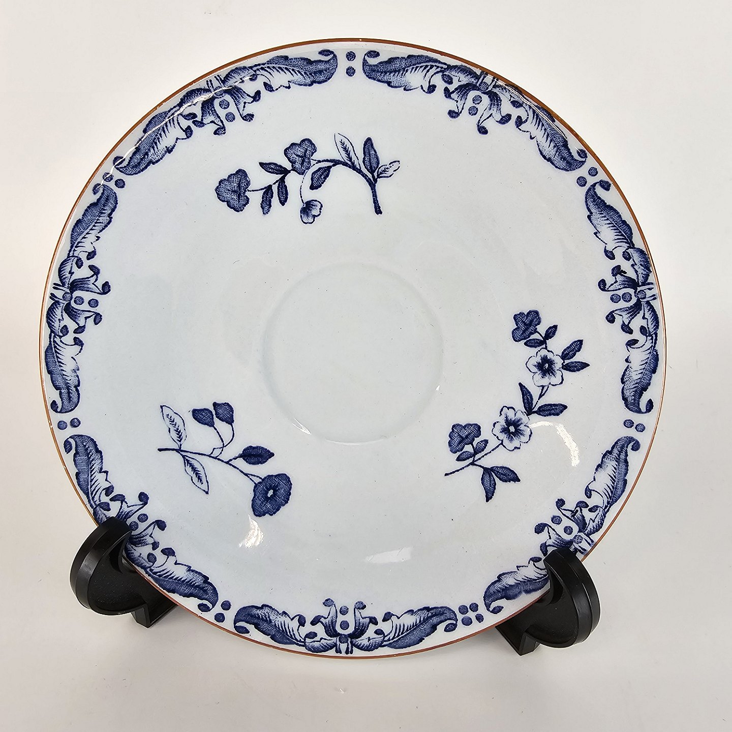 Hvidt porcelæn dekoreret med delikate blå blomster og mønster med blade