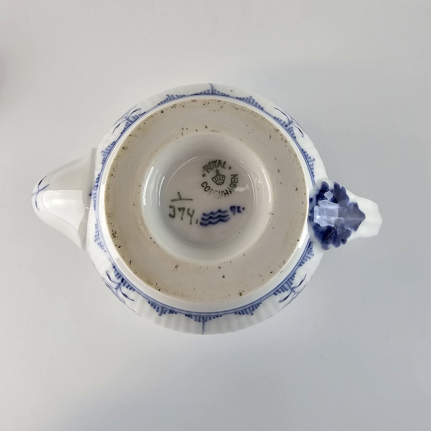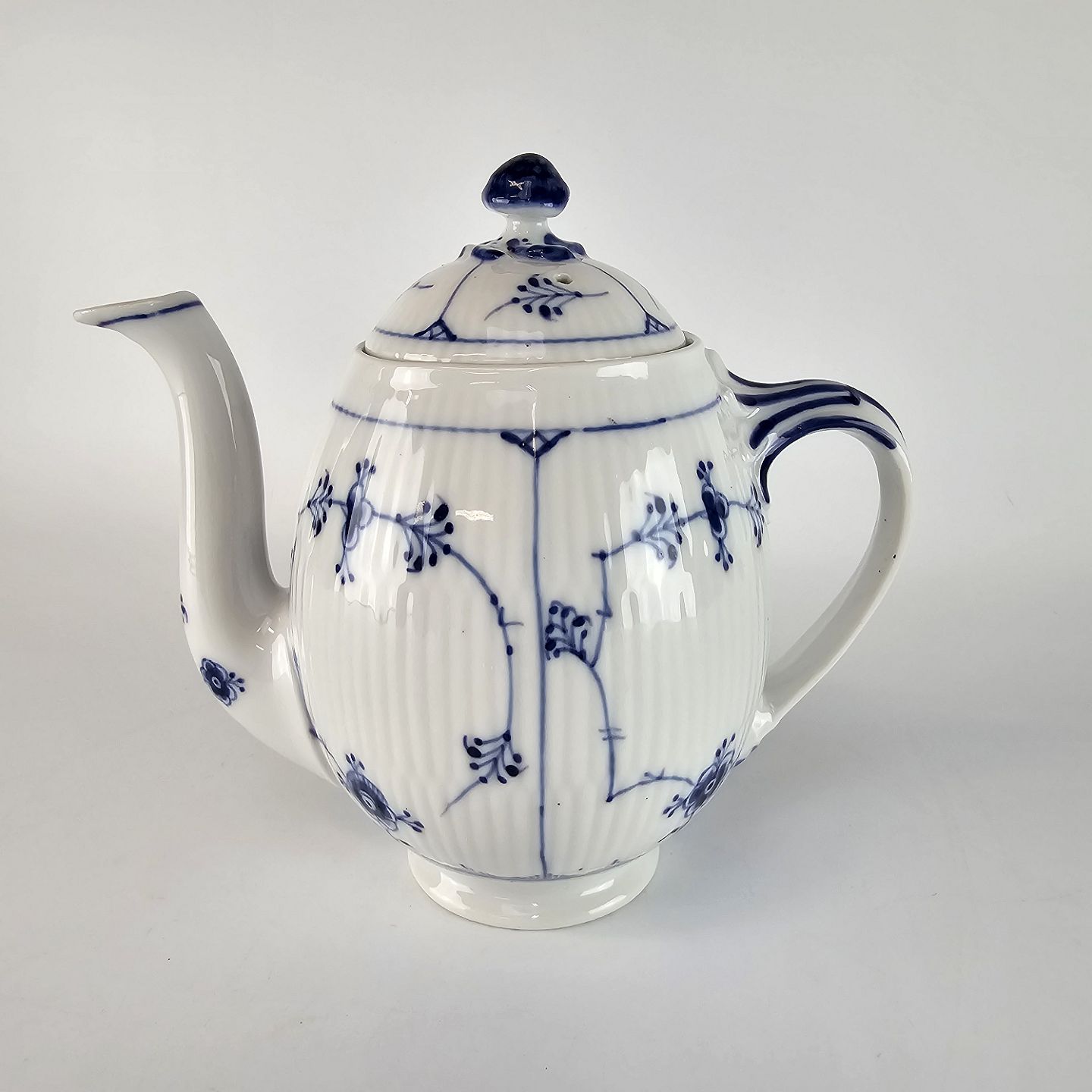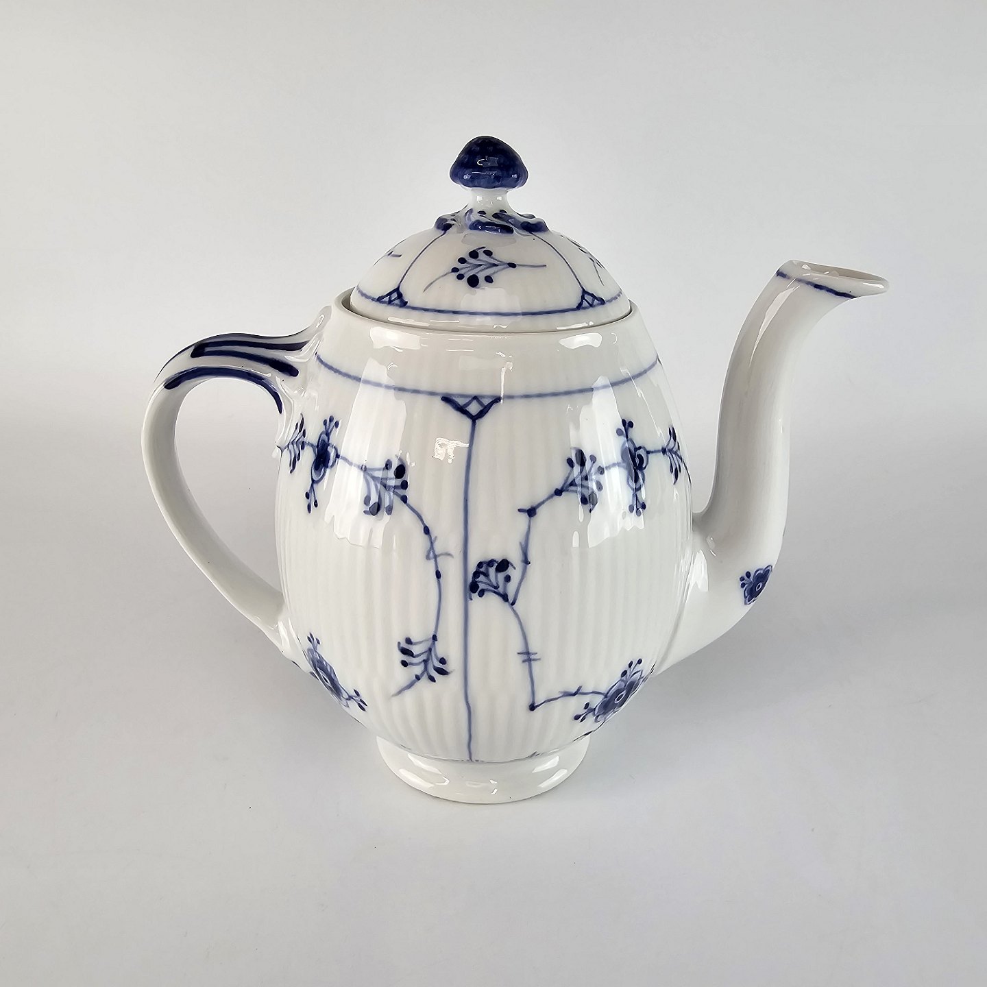 Musselmalet er af kongeligt hvidt porcelæn, dekoreret med rifler og mønster af blå ranker og blomster