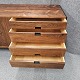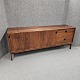 Skænk af palisander, med to skydelåger. Bag den en låg er der 4 skuffer, bag den anden er der hylder.