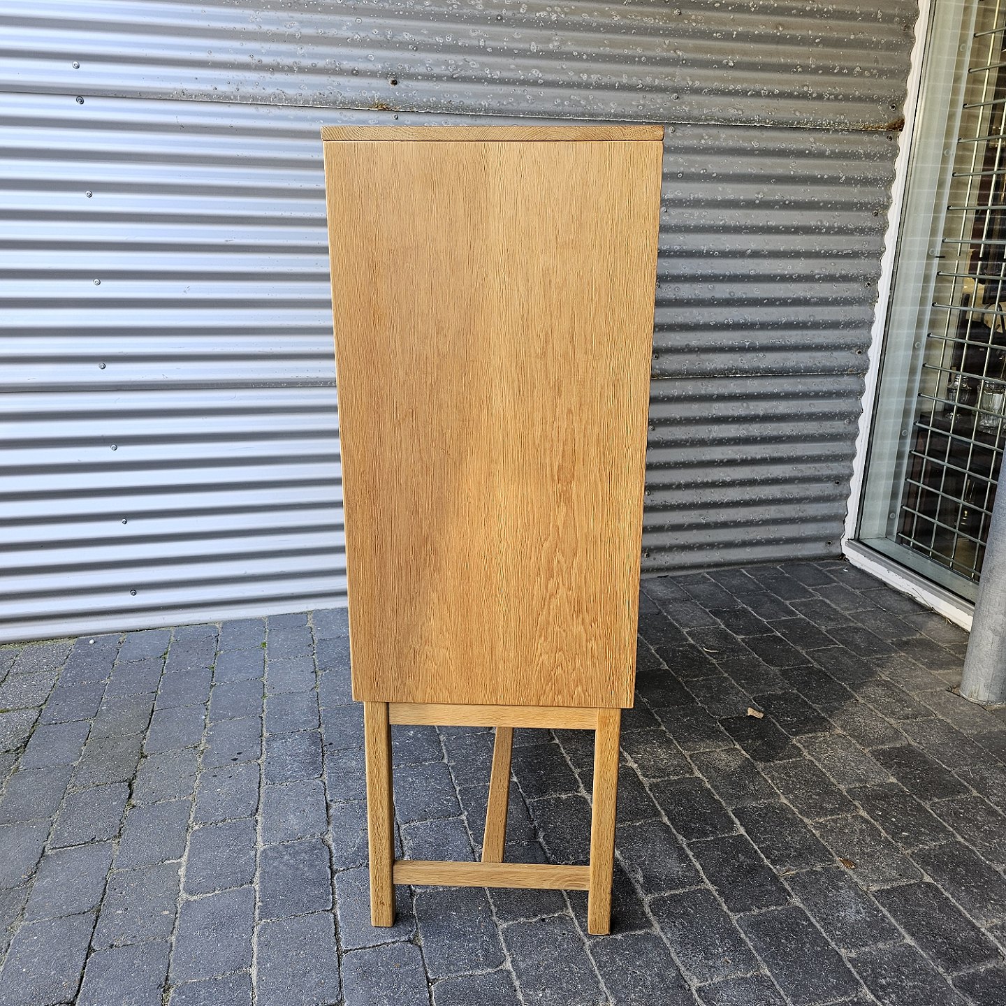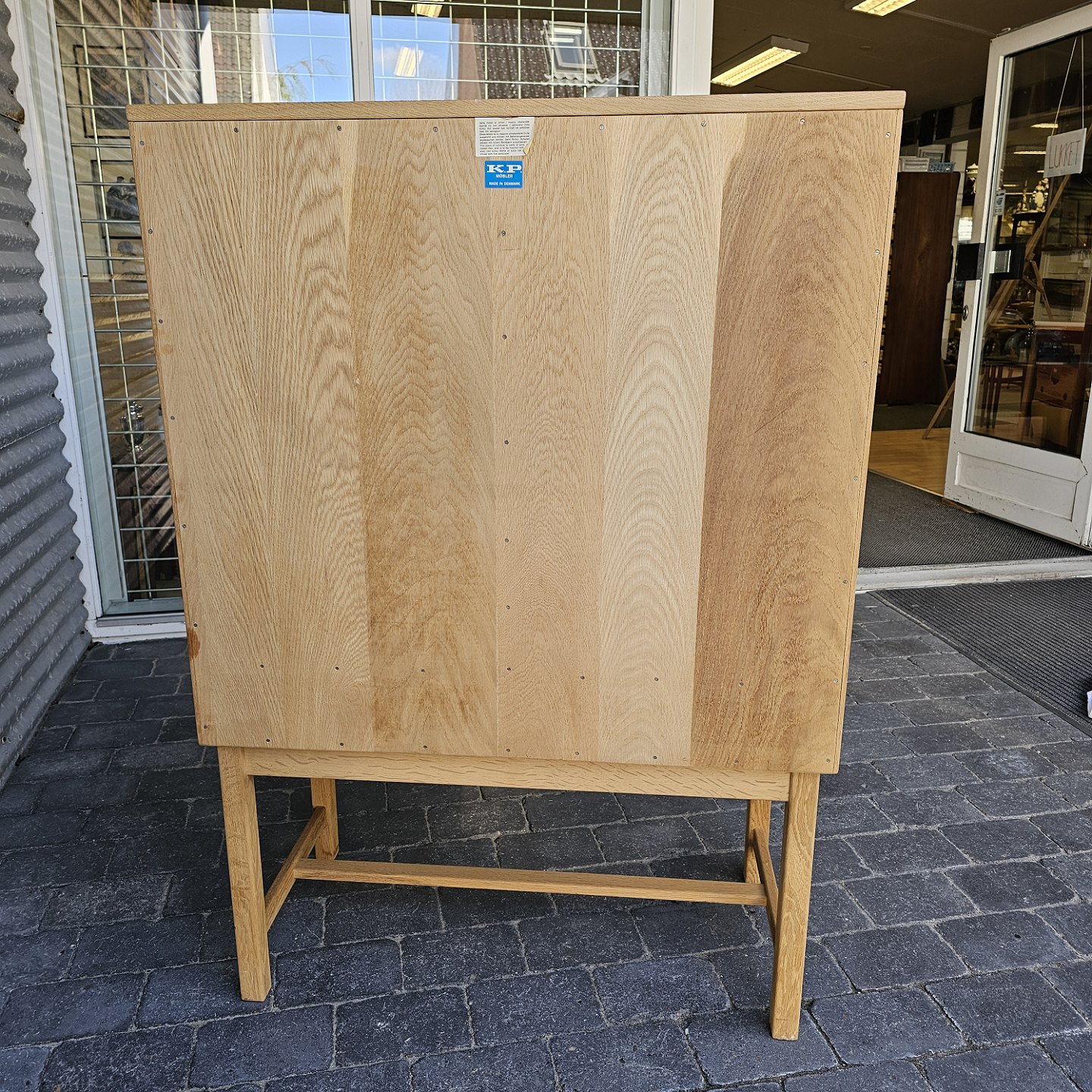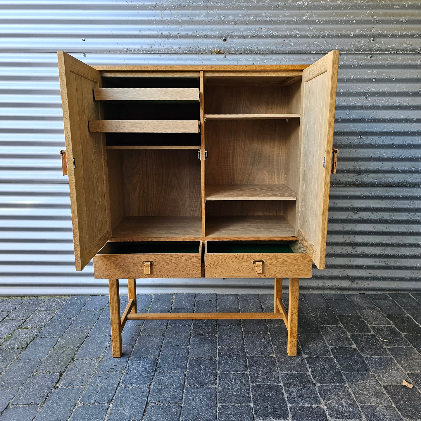 Bestikskab i massivt ubehandlet egetræ. Bag lågerne er der hylder og skuffer. Grebene er af beige læder