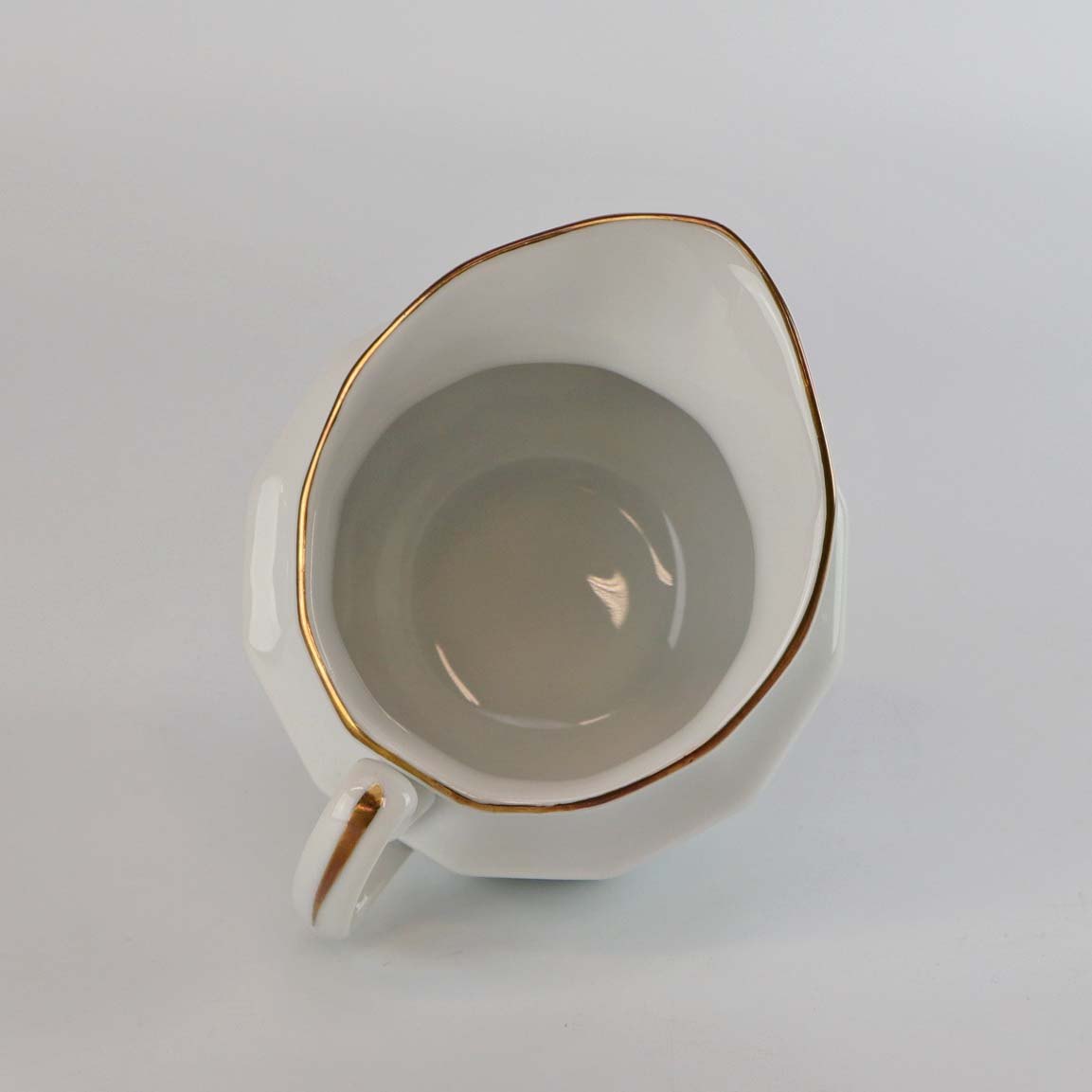 Kande i glat kantet hvidt porcelæn med faverige motiver af blomster og guldkant