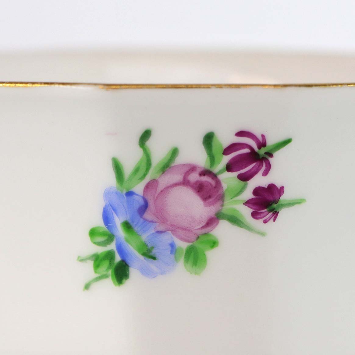 Kop i glat kantet hvidt porcelæn med faverige motiver af blomster og guldkant