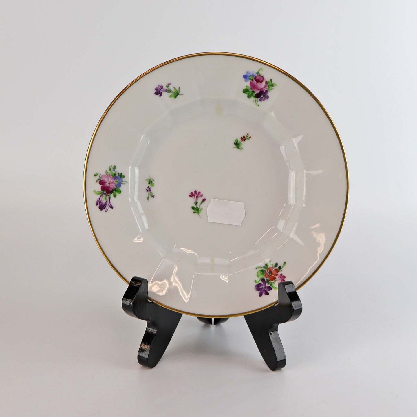 Tallerken i glat kantet hvidt porcelæn med faverige motiver af blomster og guldkant