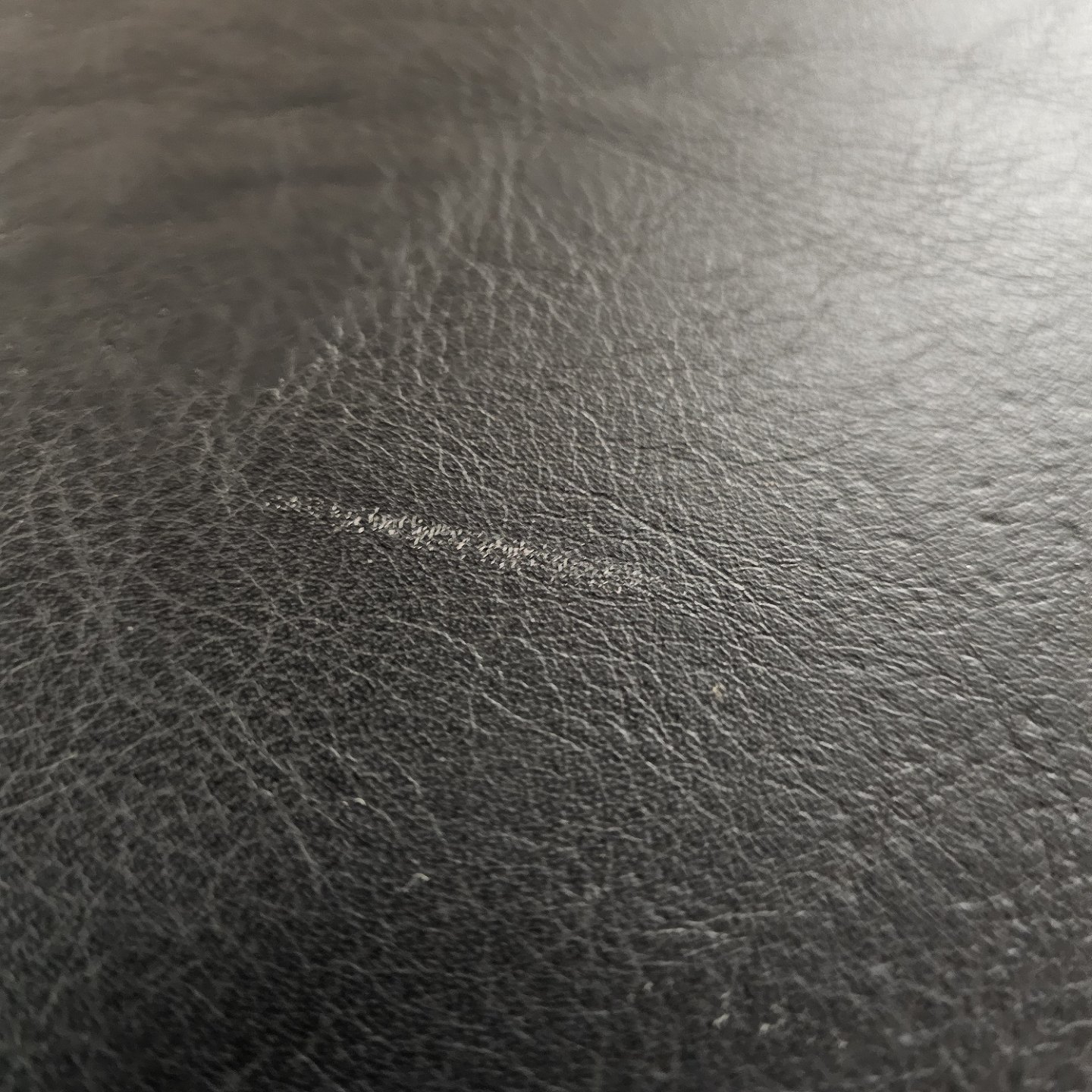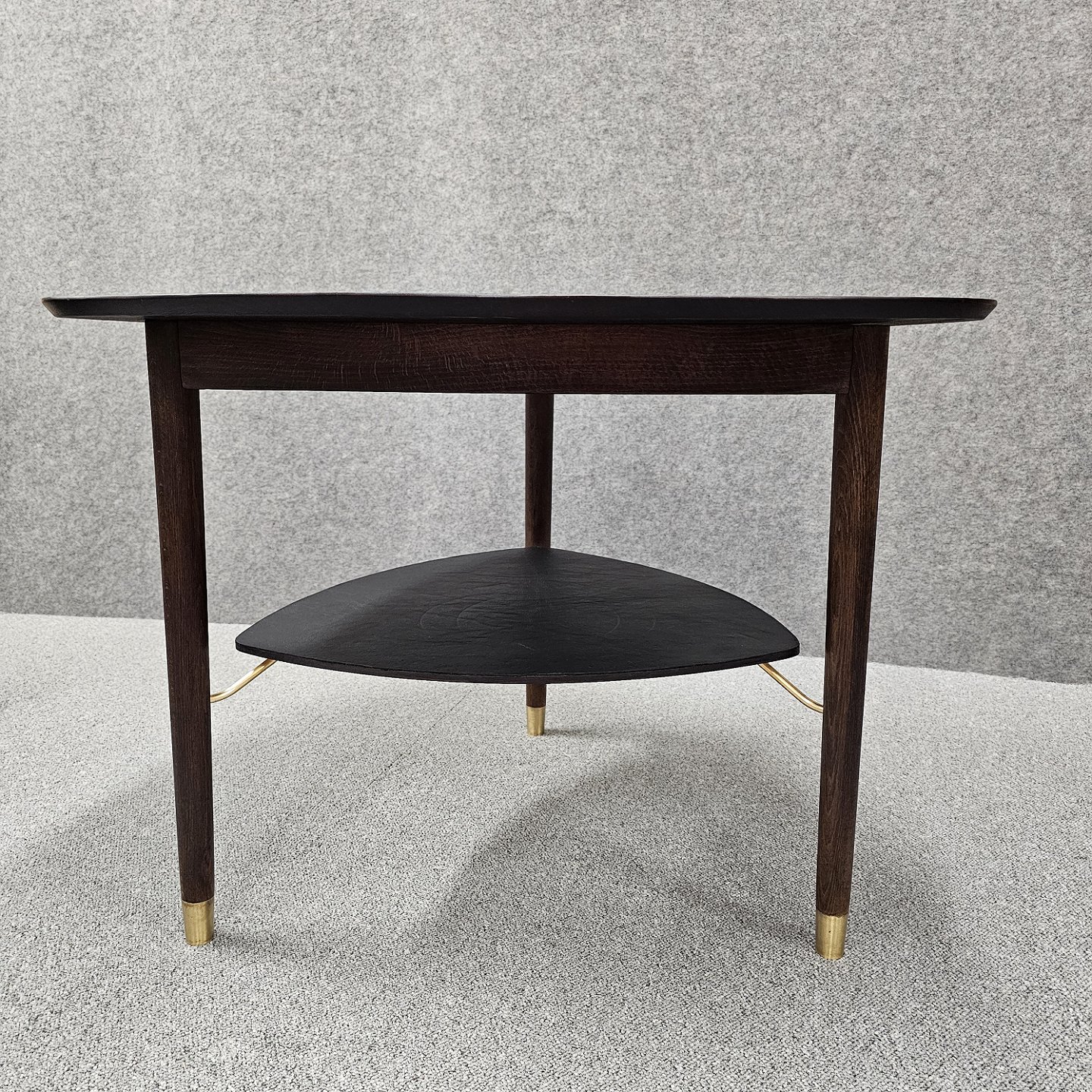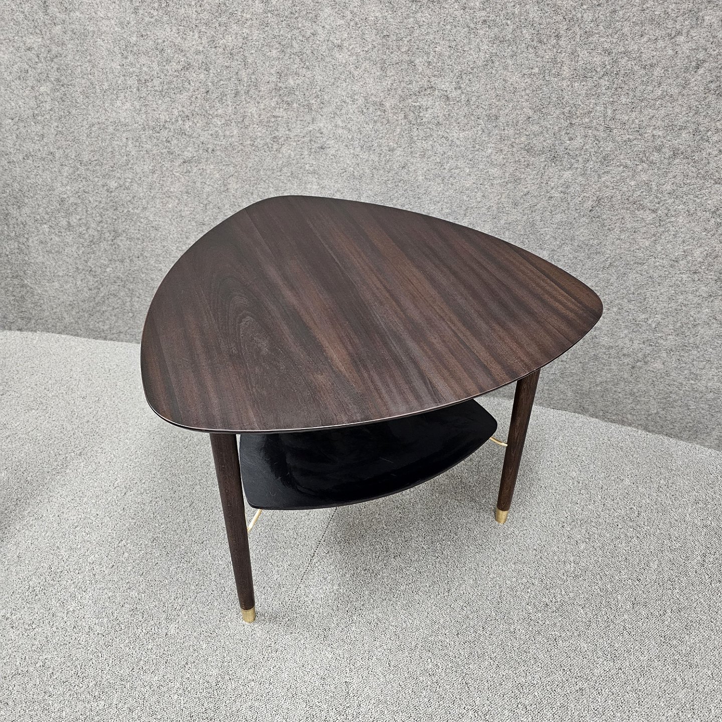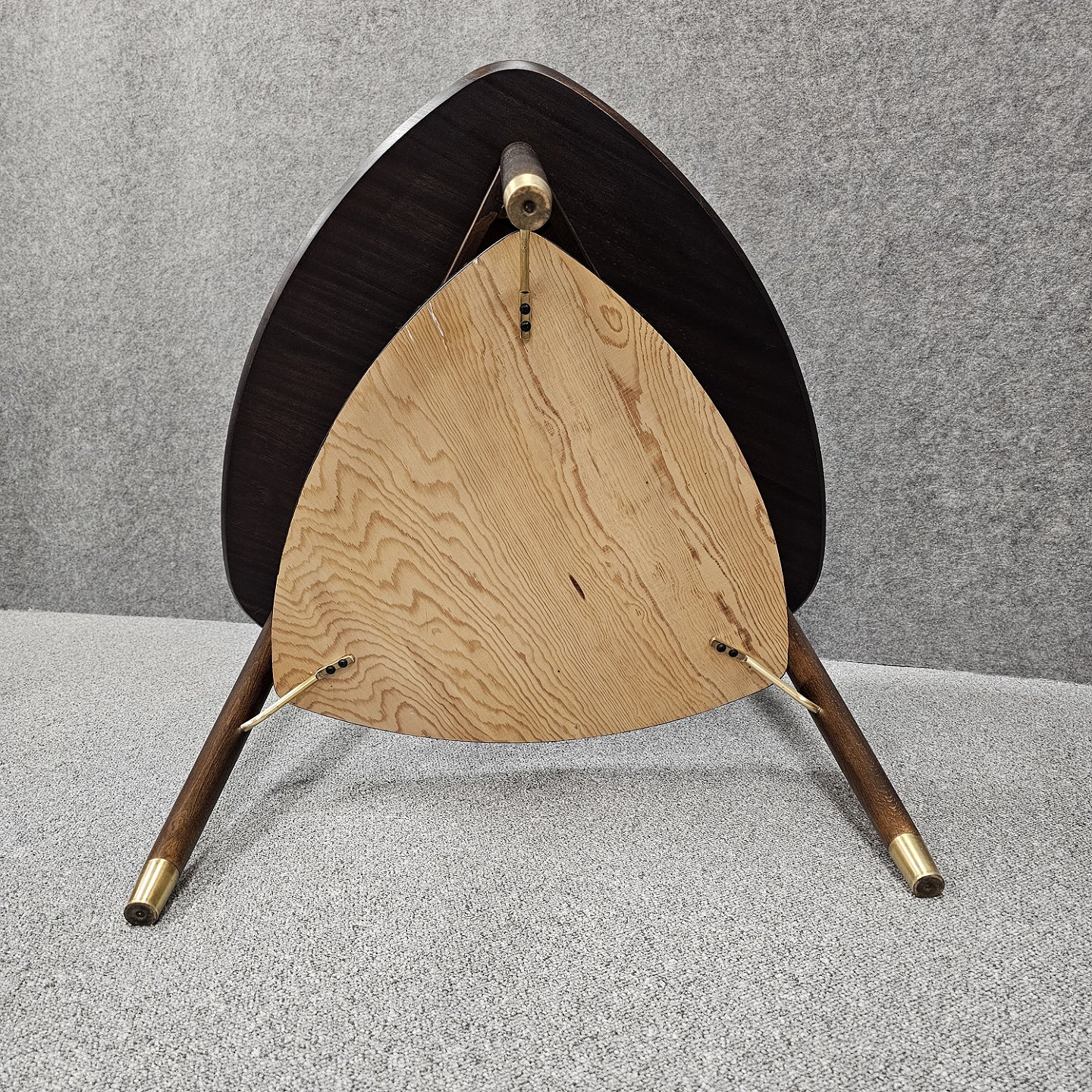 Trekantet sidebord i teaktræ malet med mørk bejdse og pyntet med messing. Hylden er beklædt med læder. Bordet er nyrestaureret