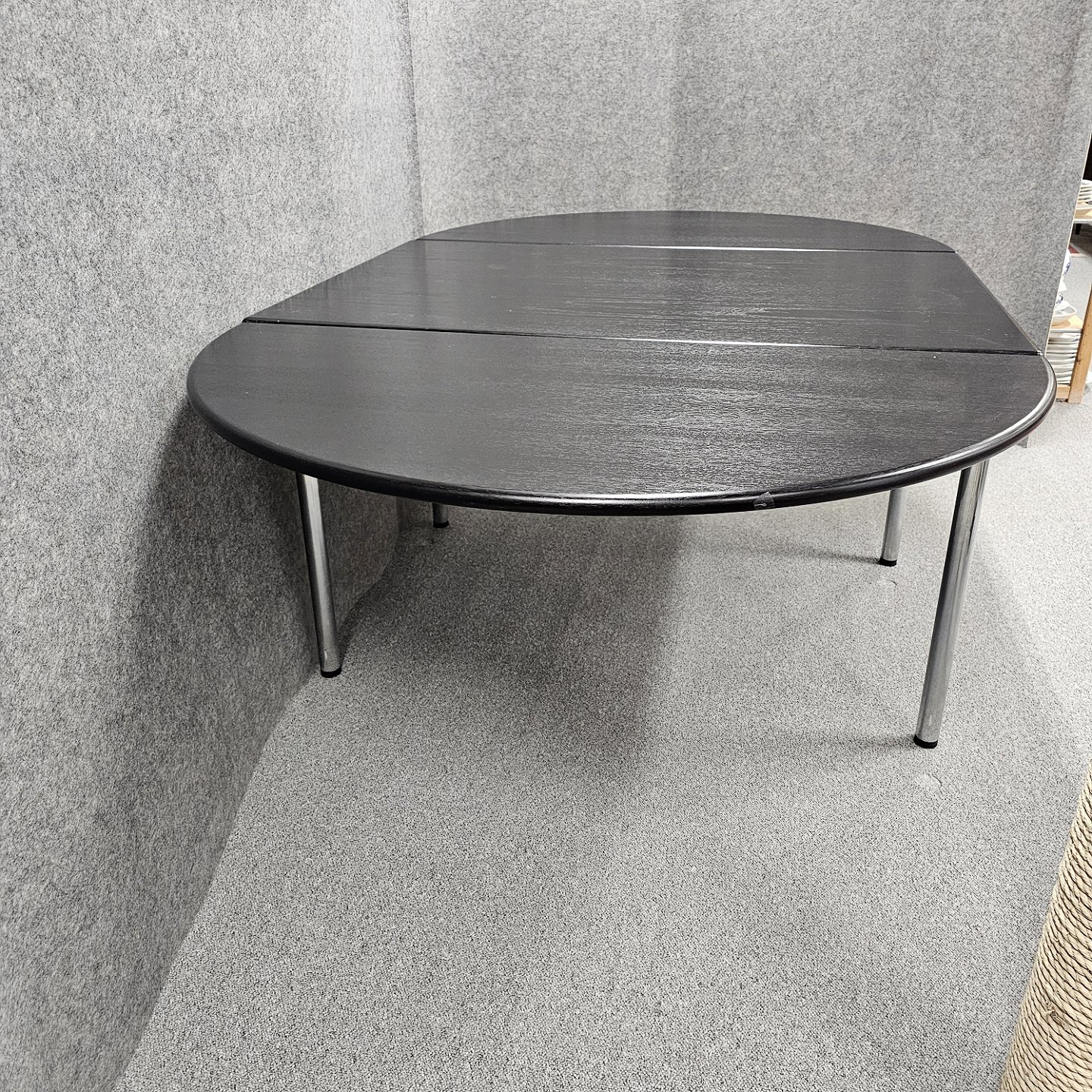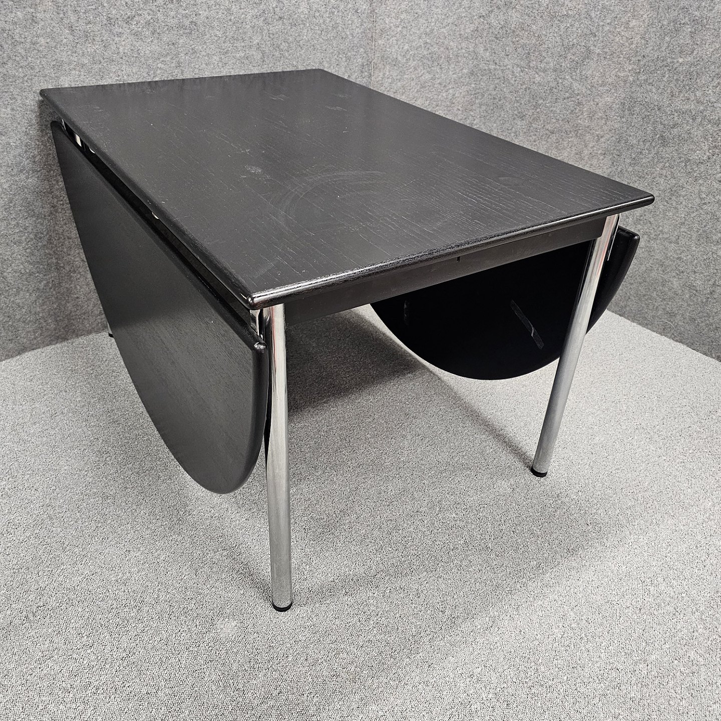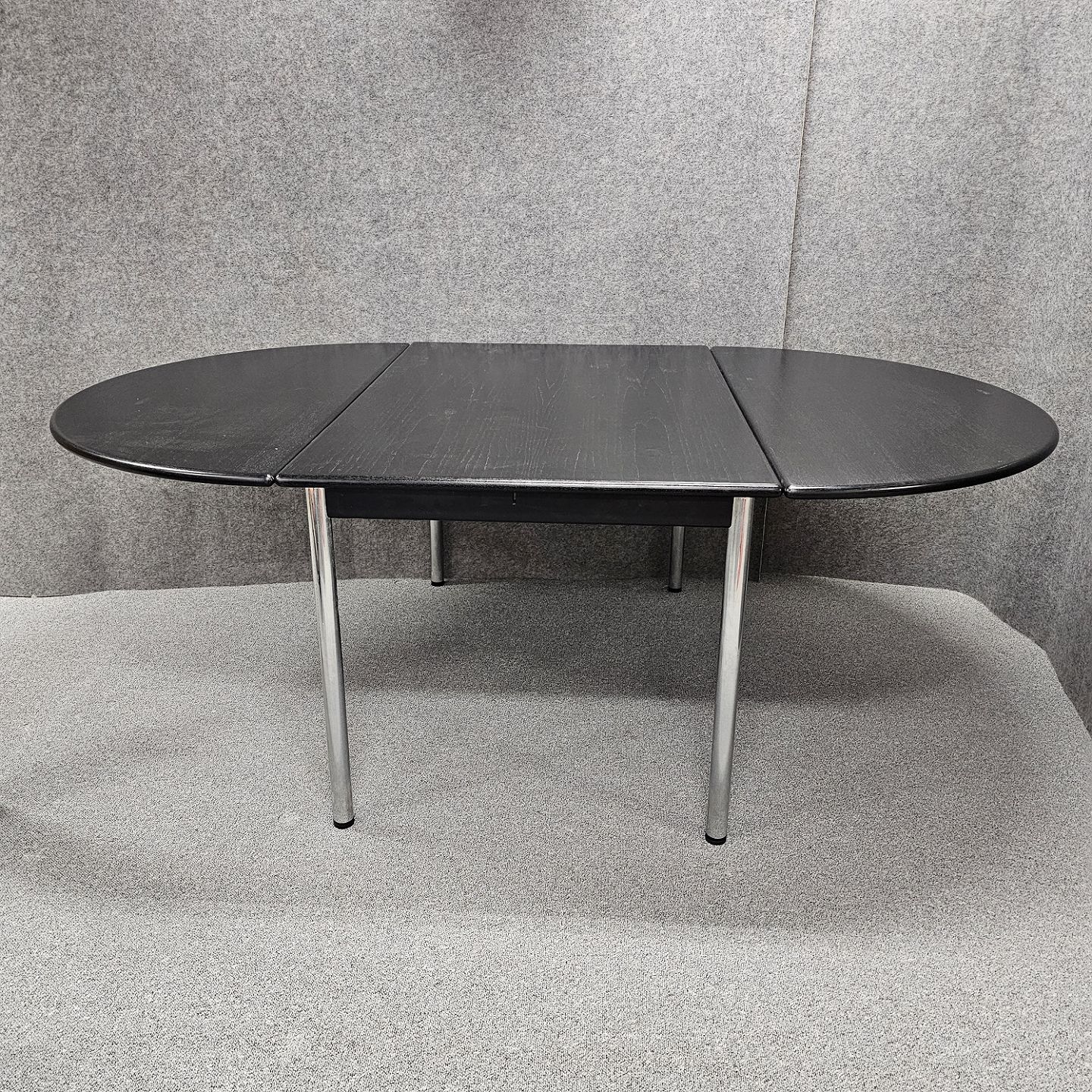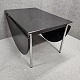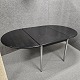 Ovalt spisebord med klap i begge ender. Sortlakeret bordplade med blanke stålben. Produceret i 1981