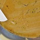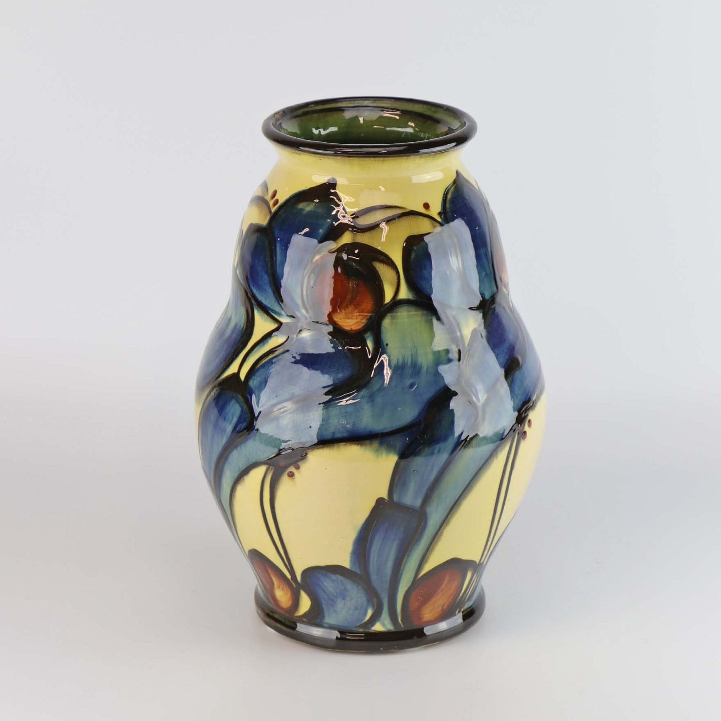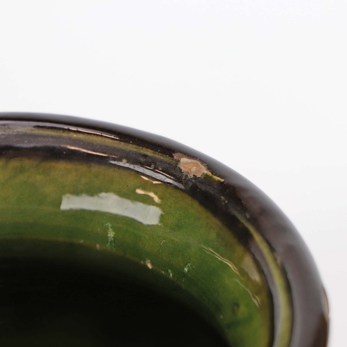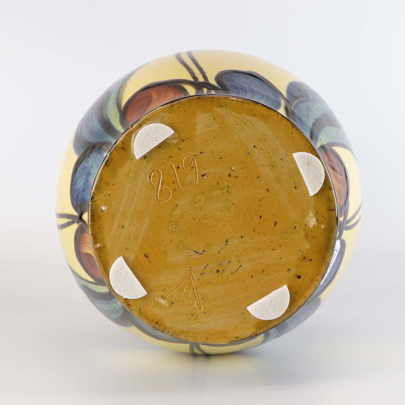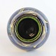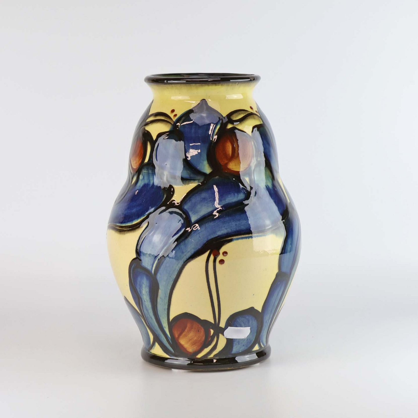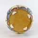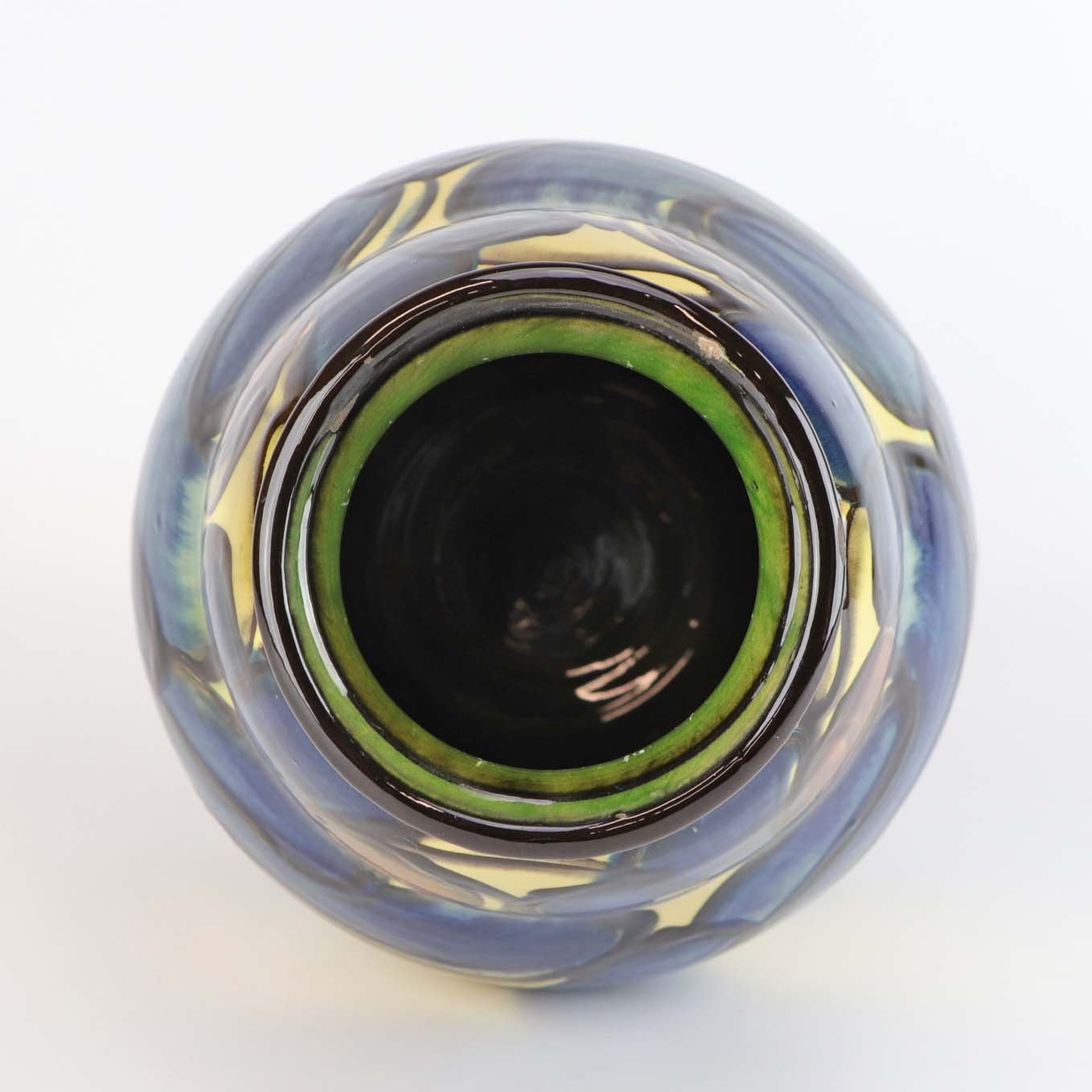 Vase i keramik med abstrakt glaseret mønster i blå go brune nuancer på gullig baggrund med indvendig grøn glasur nr 819