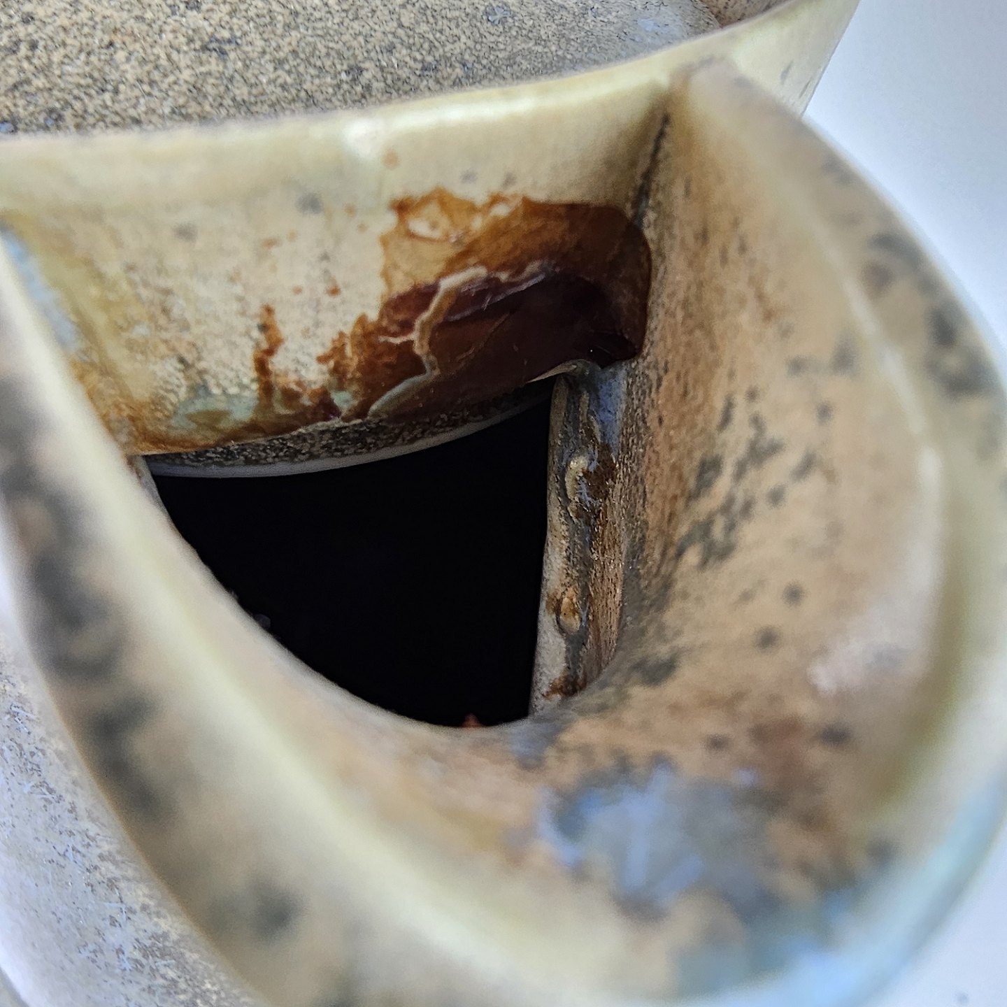 Kakaokande af stentøj og dekoreret med en grønlig nuancefarvet glasering.