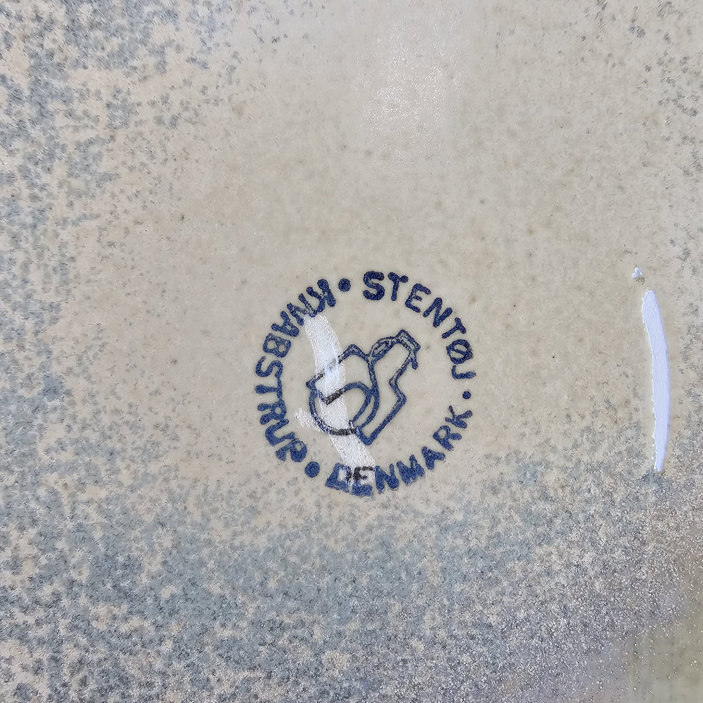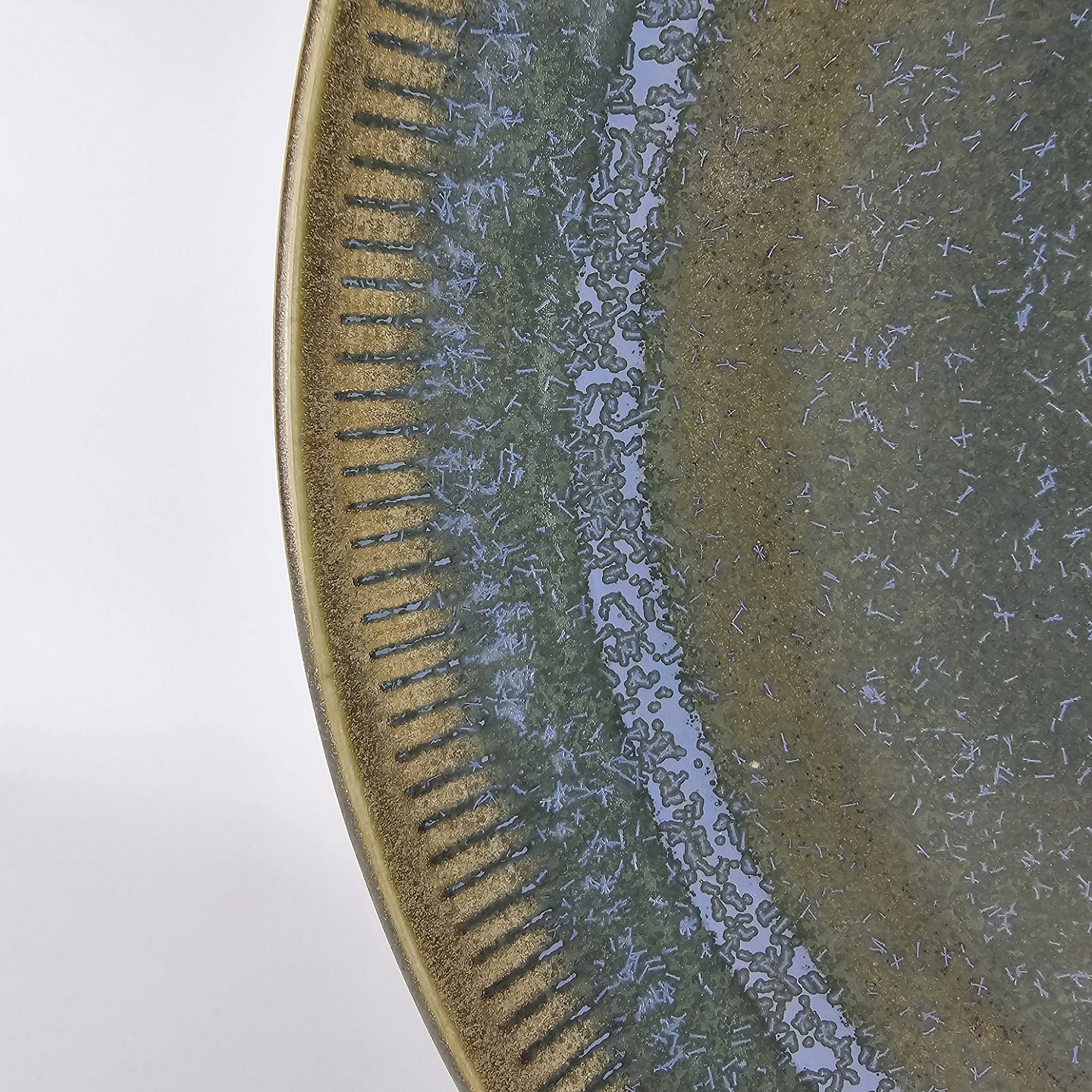 Rundt fad af stentøj og dekoreret med en grønlig nuancefarvet glasering.