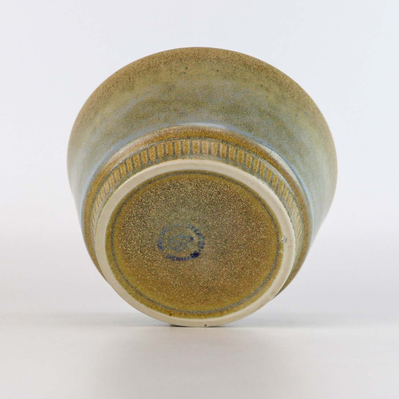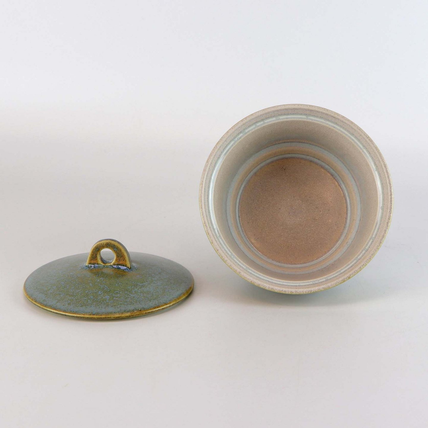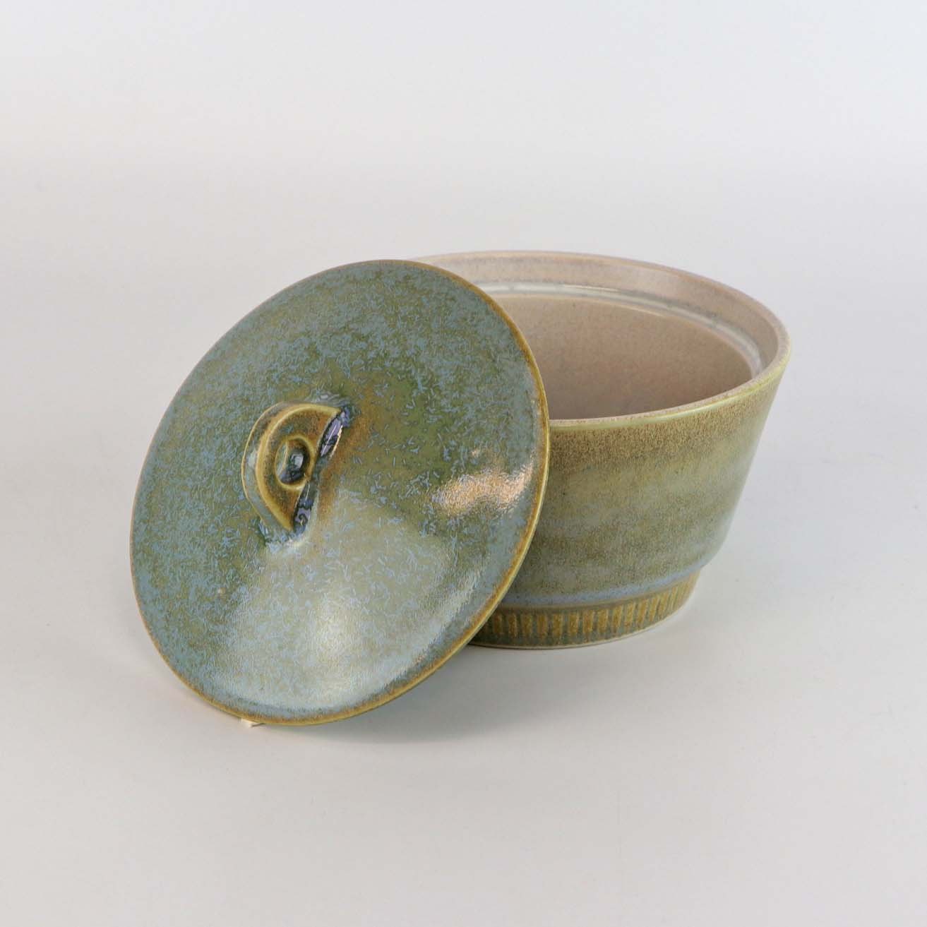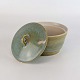 Skål med låg af stentøj og dekoreret med en grønlig nuancefarvet glasering.