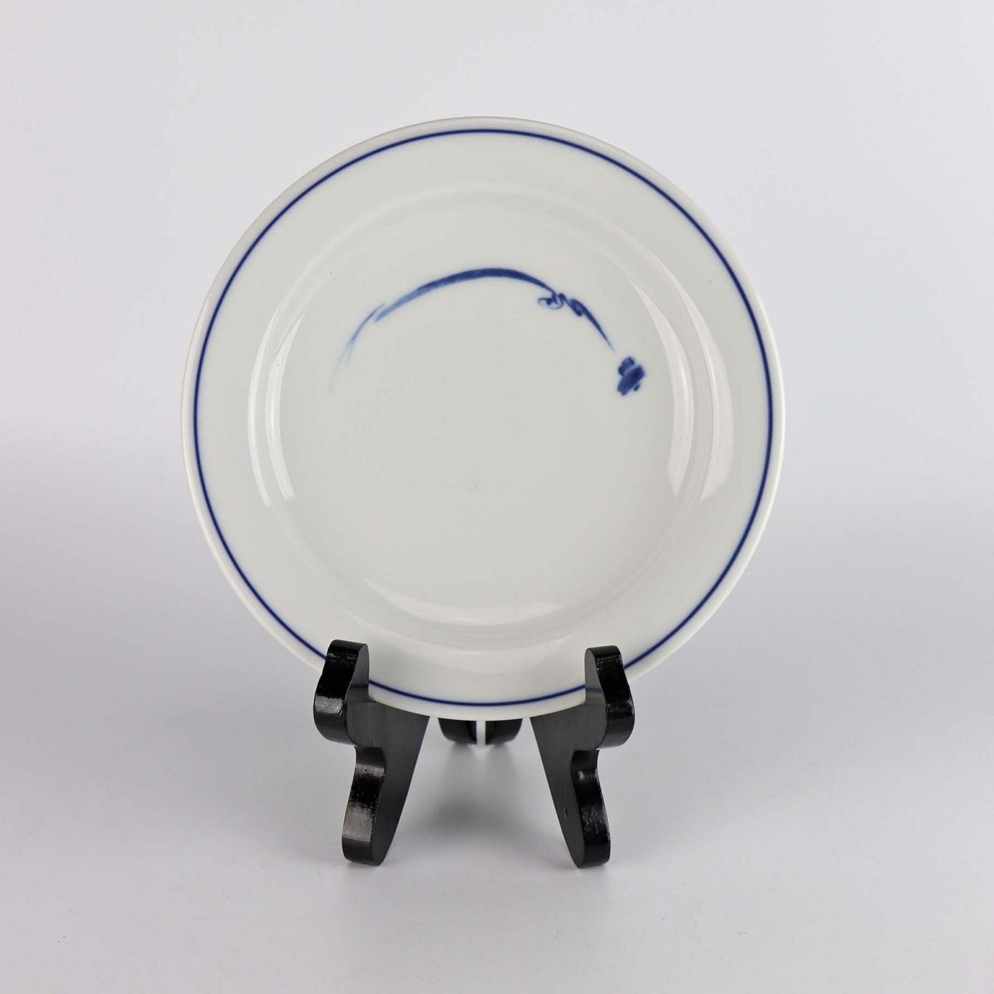Kagetallerken i glat hvidt porcelæn med abstrakt mønster i blå nuancer