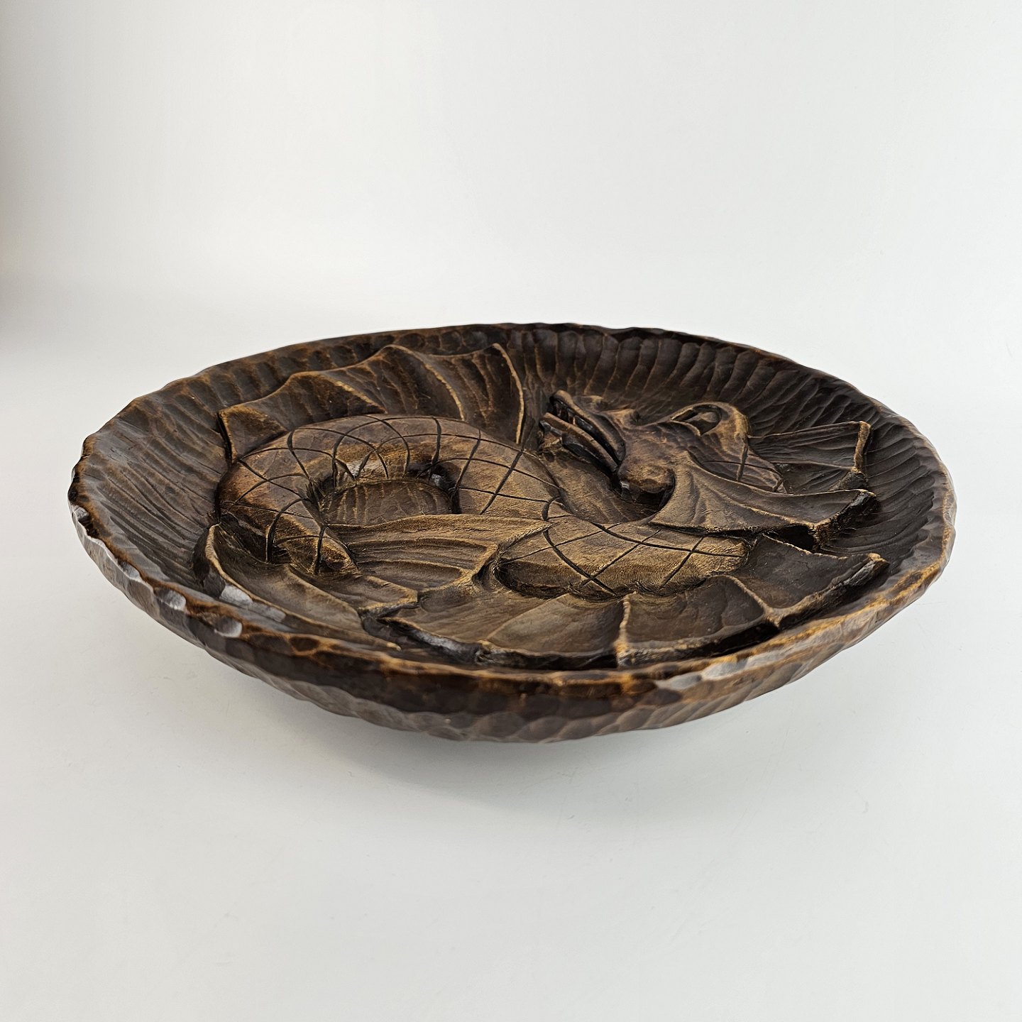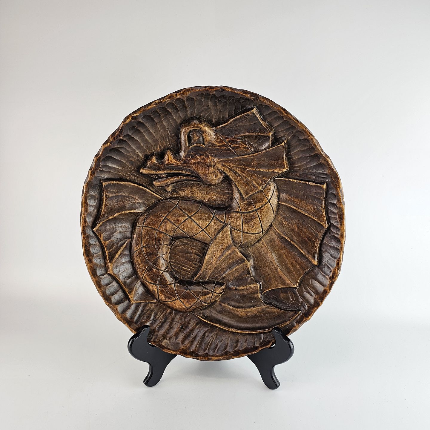 Rundt trærelief til ophæng med motiv af havfantasiuhyre.