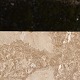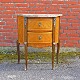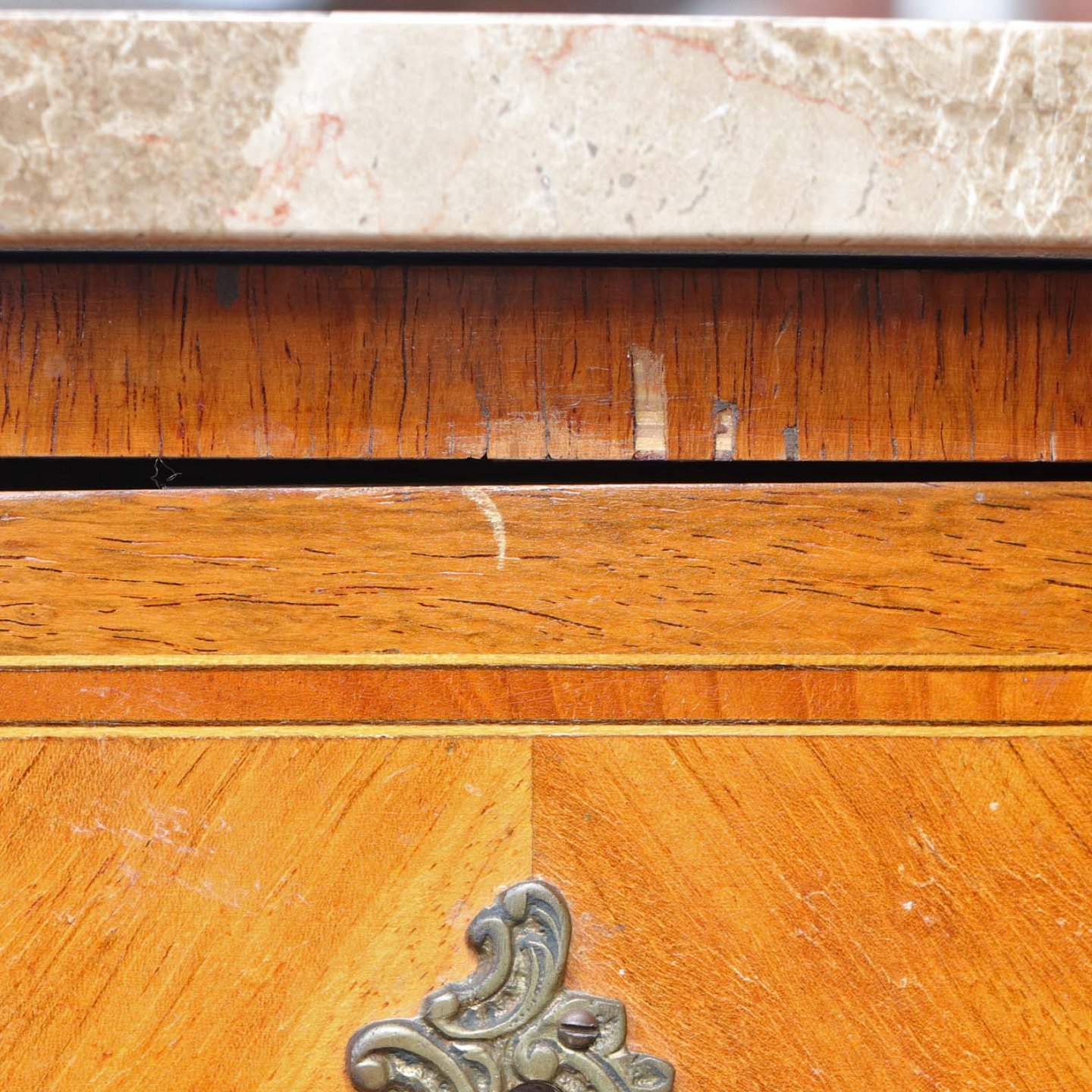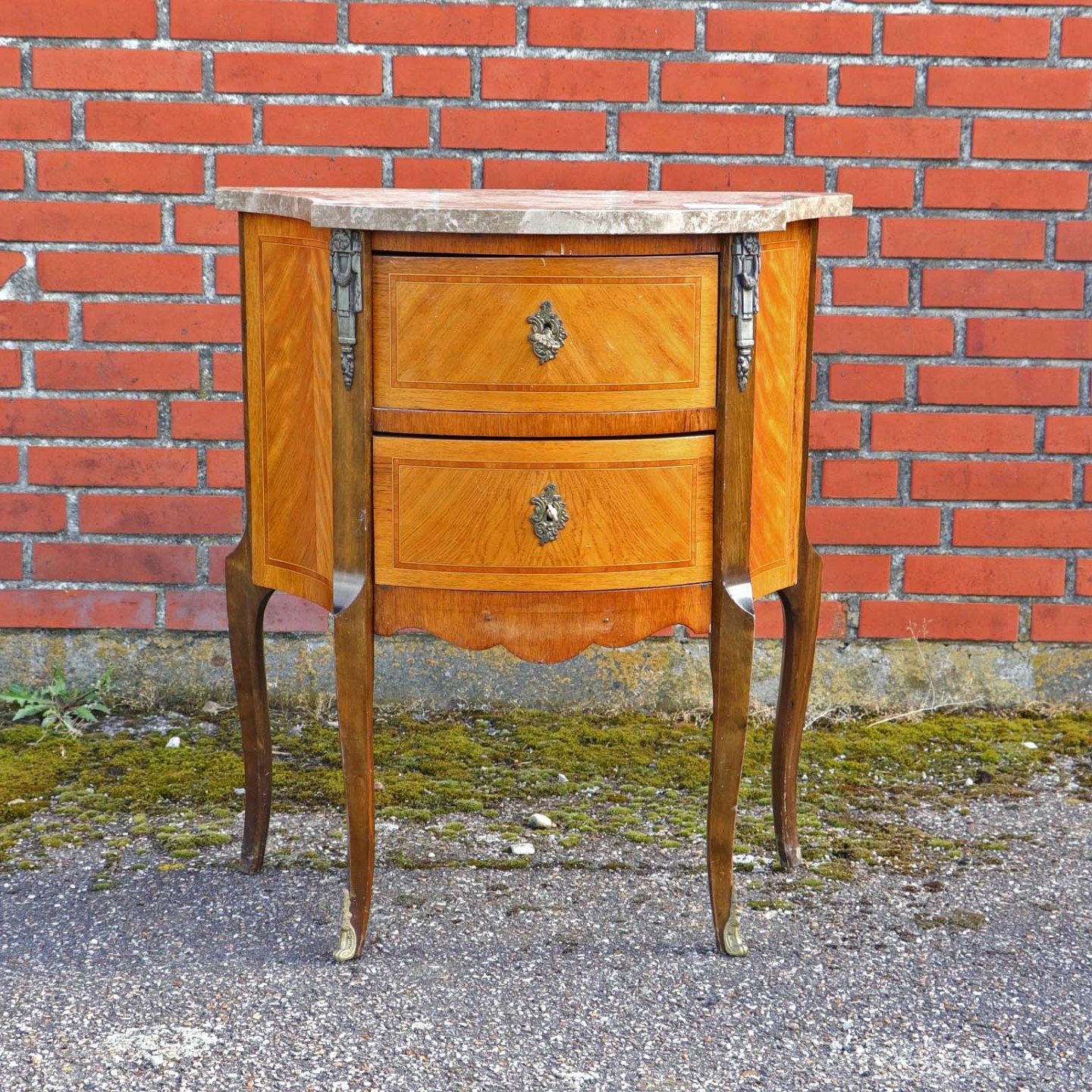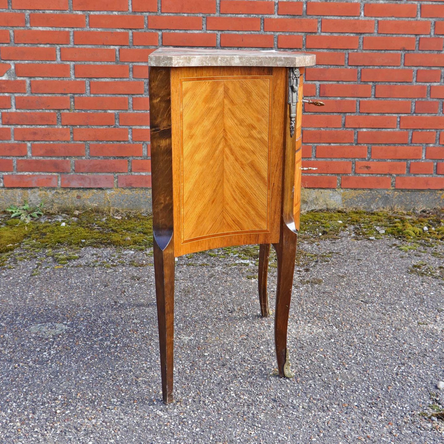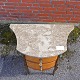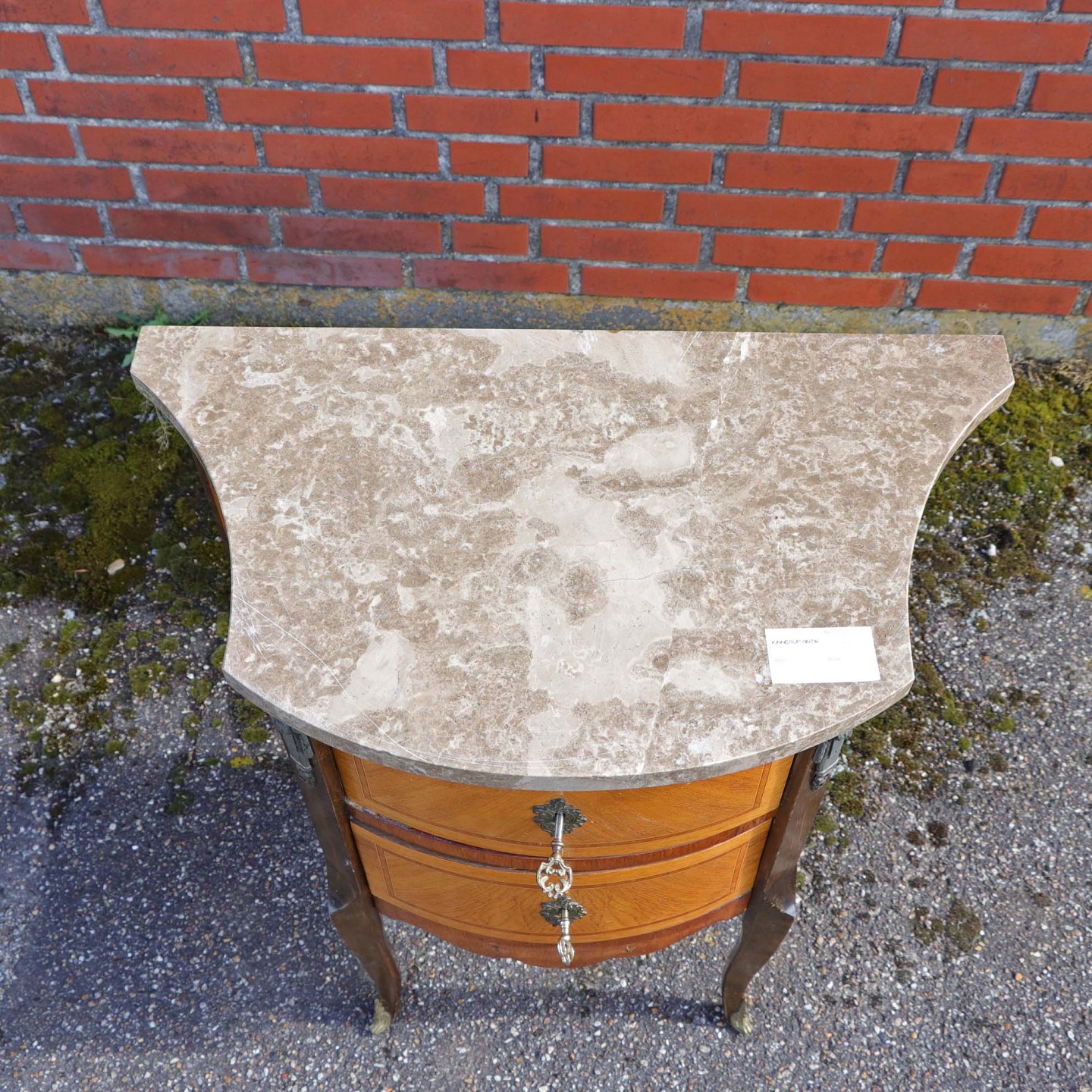 Entremøbel i mørk og lys træsort med lysebrun, beige og hvid marmorplade på toppen. Bordet er lakeret med to tilhørende nøgler i metal. Nederst på frontsiden mangler et metal ornament.