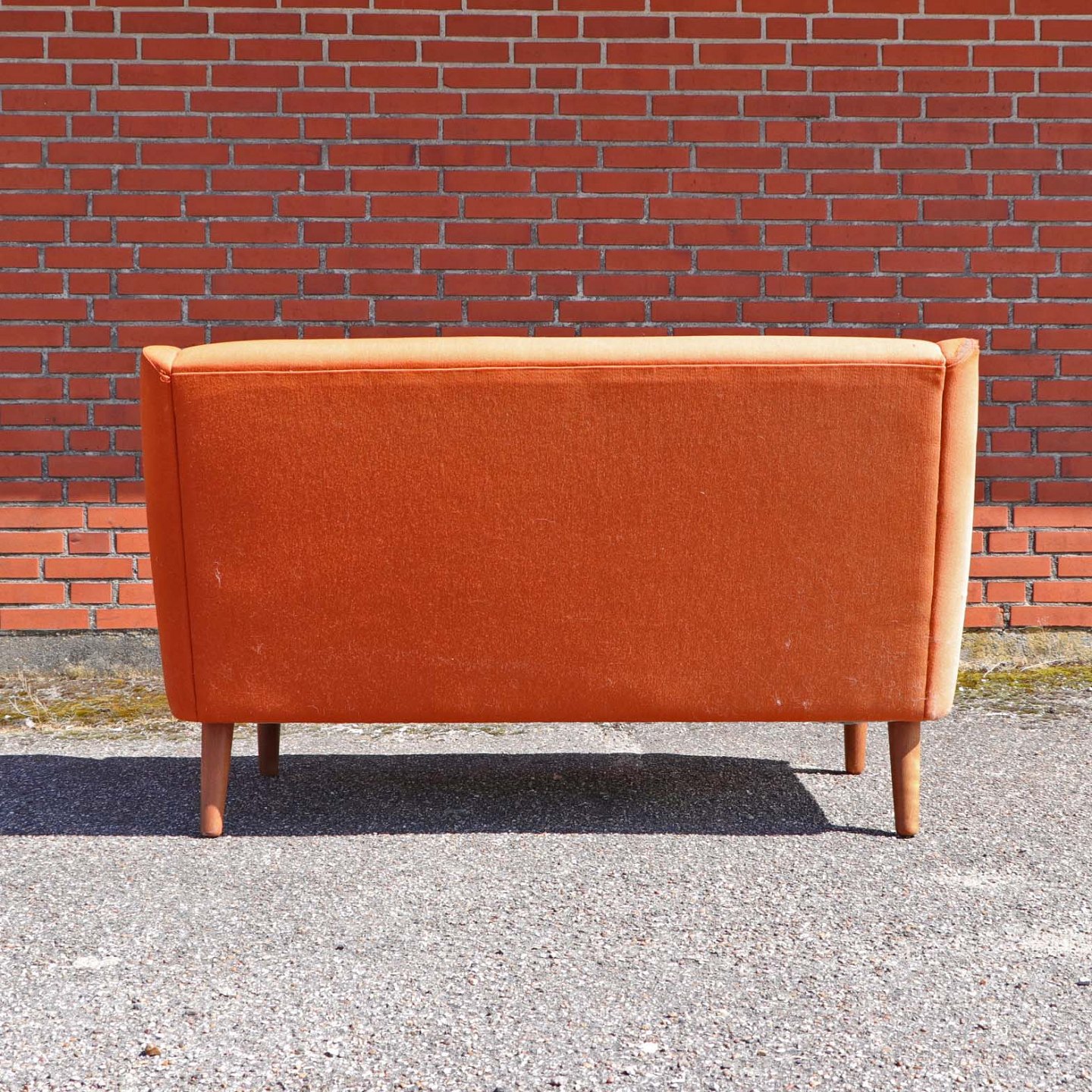 To personers sofa med solfalmet orange uldbetræk og stel i teaktræ. Sofaen trænger til ombetrækning.