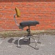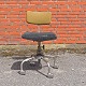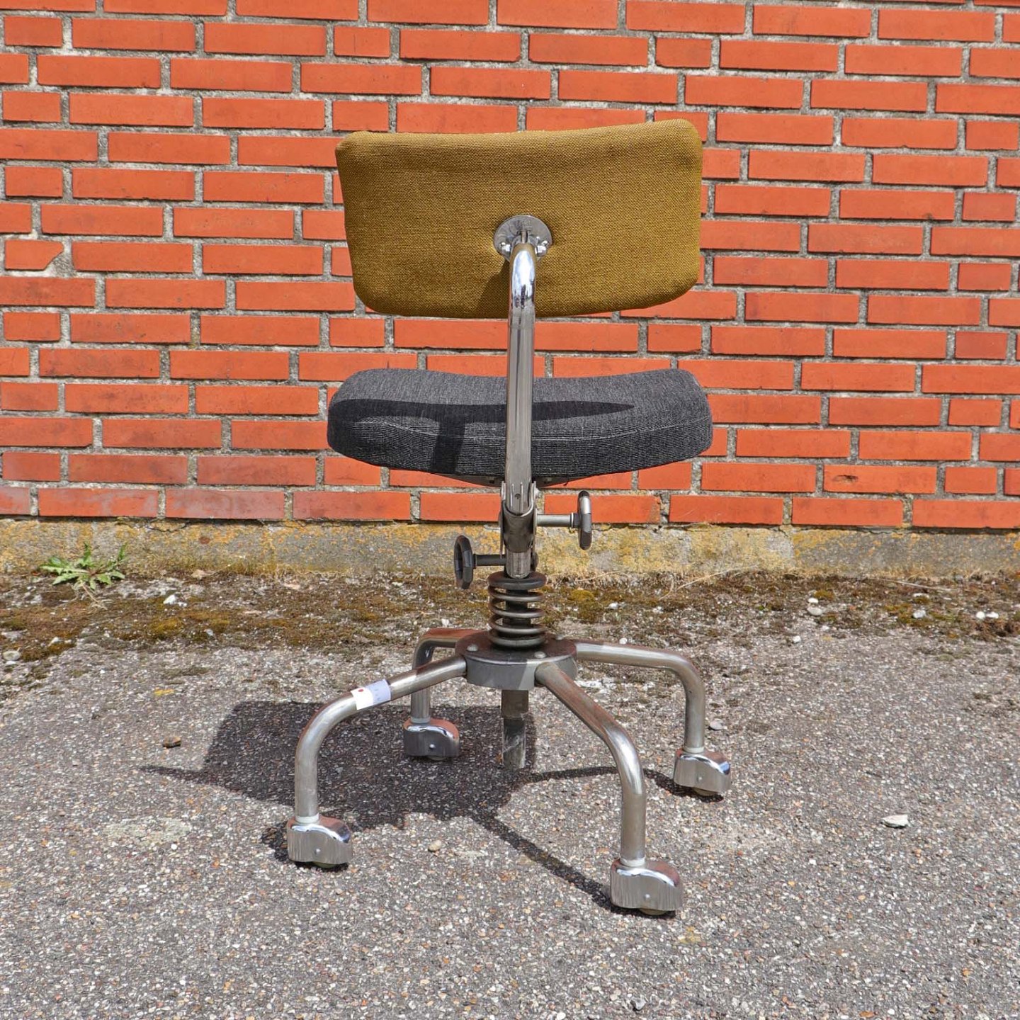 Ældre kontorstol hvor sæde og ryglæn er betrukket i koksgrå og grønlig stof og stel af metal. Regulerbar sædehøjde og rygindstilling. Stolen trænger til ombetrækning af sædet.