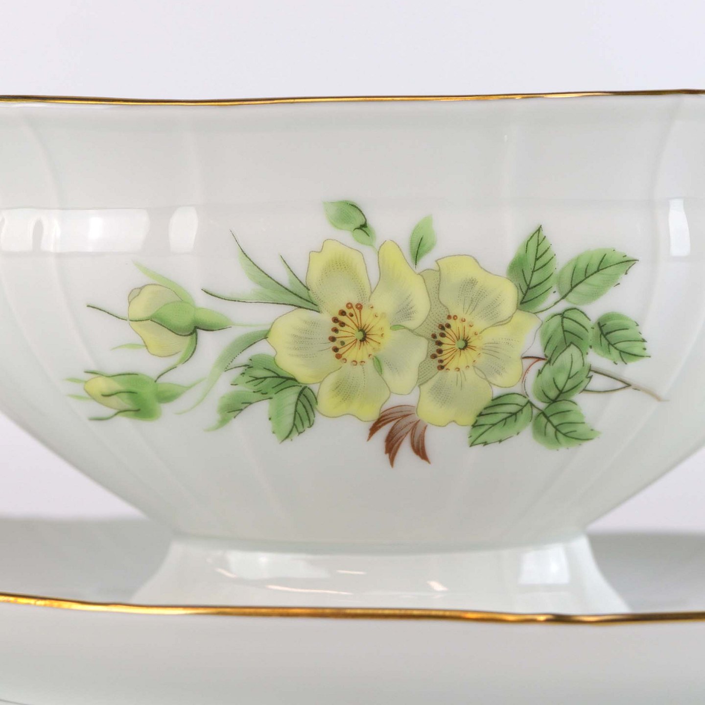 Service i glat hvidt porcelæn med lige knækkede kanter dekoreret med gule blomster og gylden kant