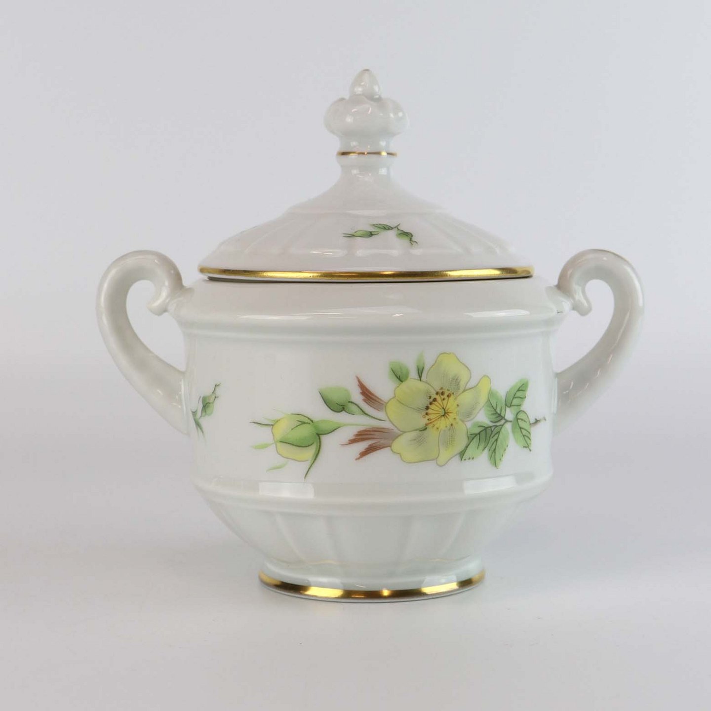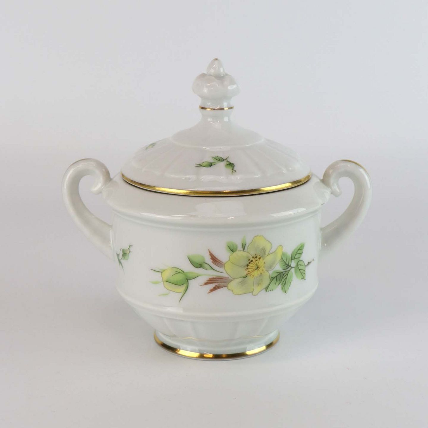 Service i glat hvidt porcelæn med lige knækkede kanter dekoreret med gule blomster og gylden kant