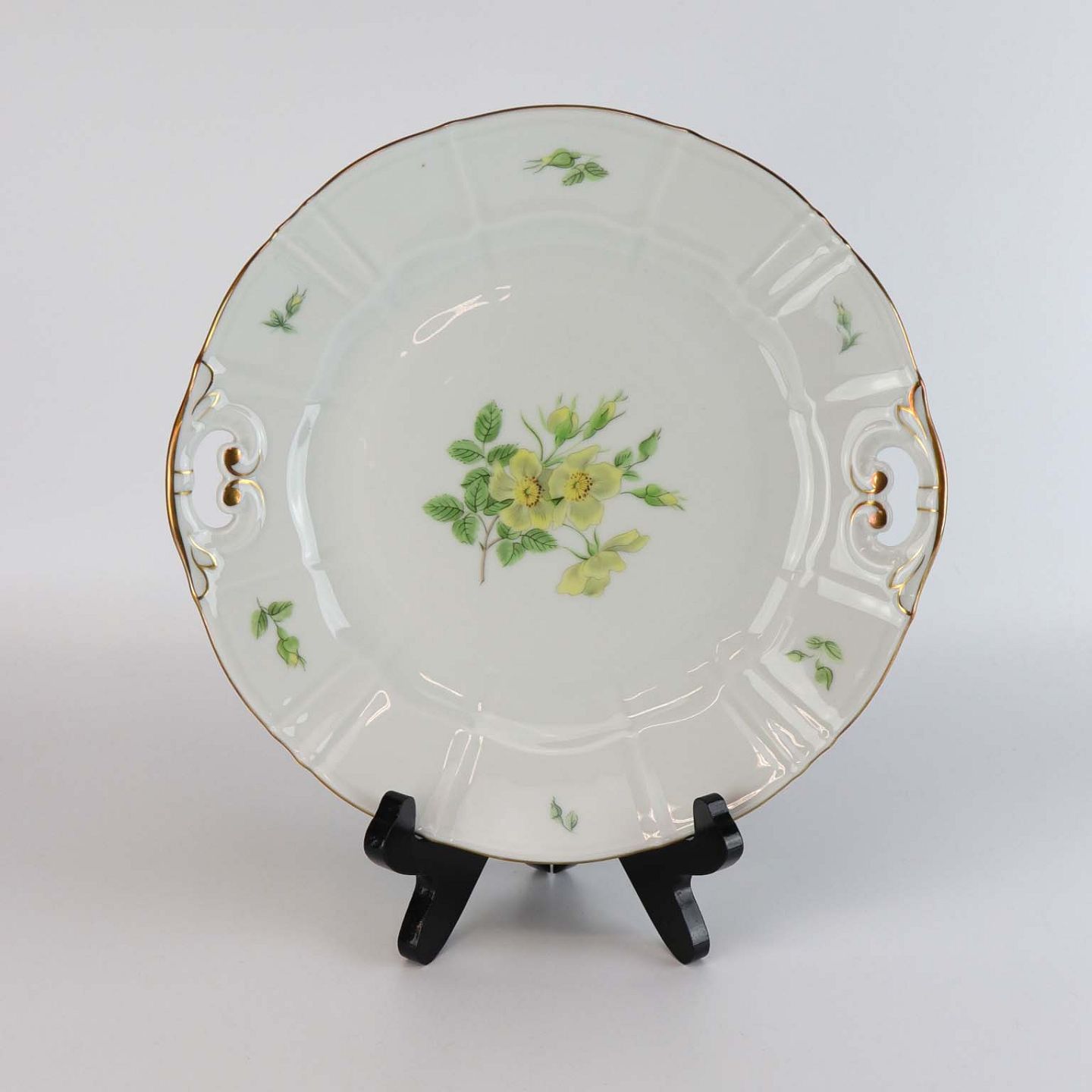 Rundt kagefad i porcelæn med hanke fra stellet Klitrose. Nr. 304