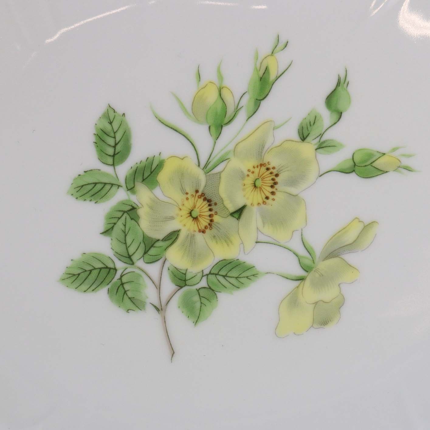 Service i glat hvidt porcelæn med lige knækkede kanter dekoreret med gule blomster og gylden kant