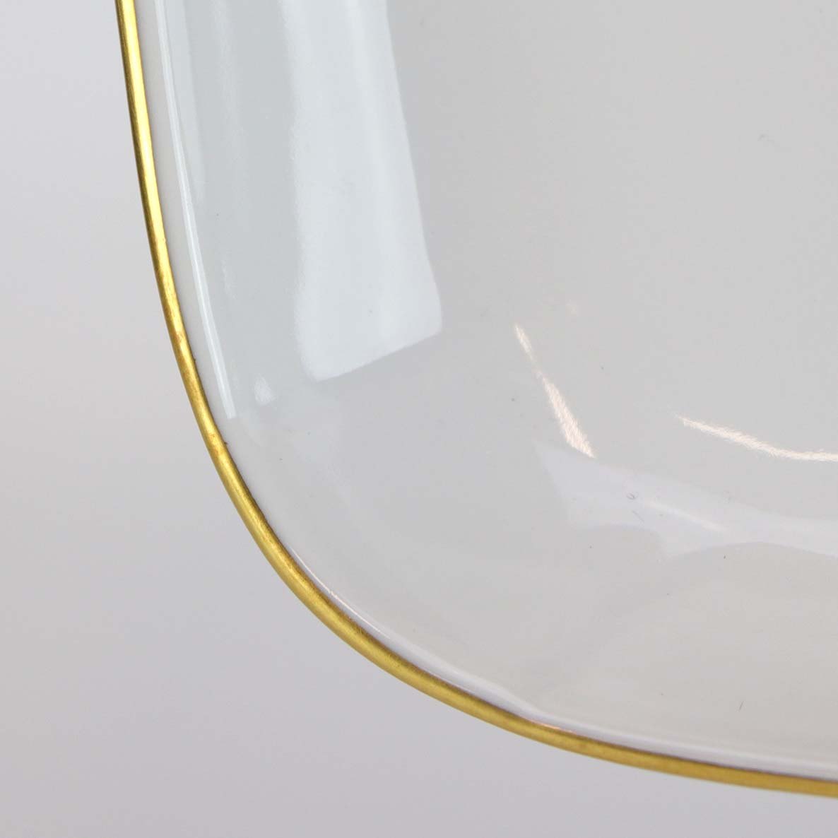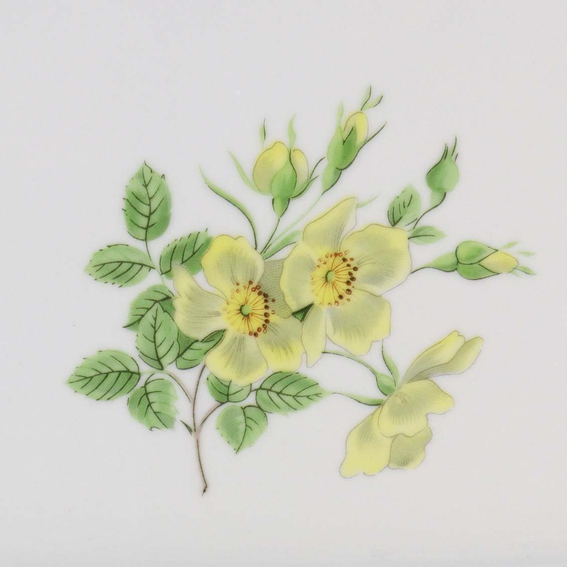 Service i glat hvidt porcelæn med lige knækkede kanter dekoreret med gule blomster og gylden kant