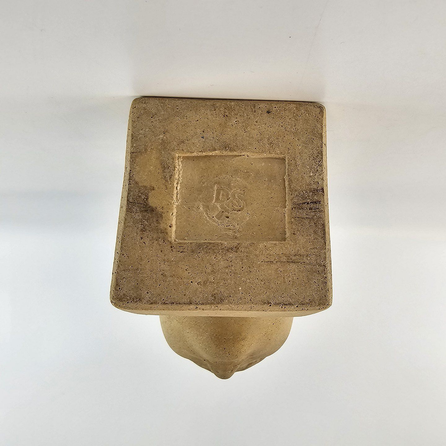 Buste af sandsten formet som et barnehoved. Står på kvadratisk fod