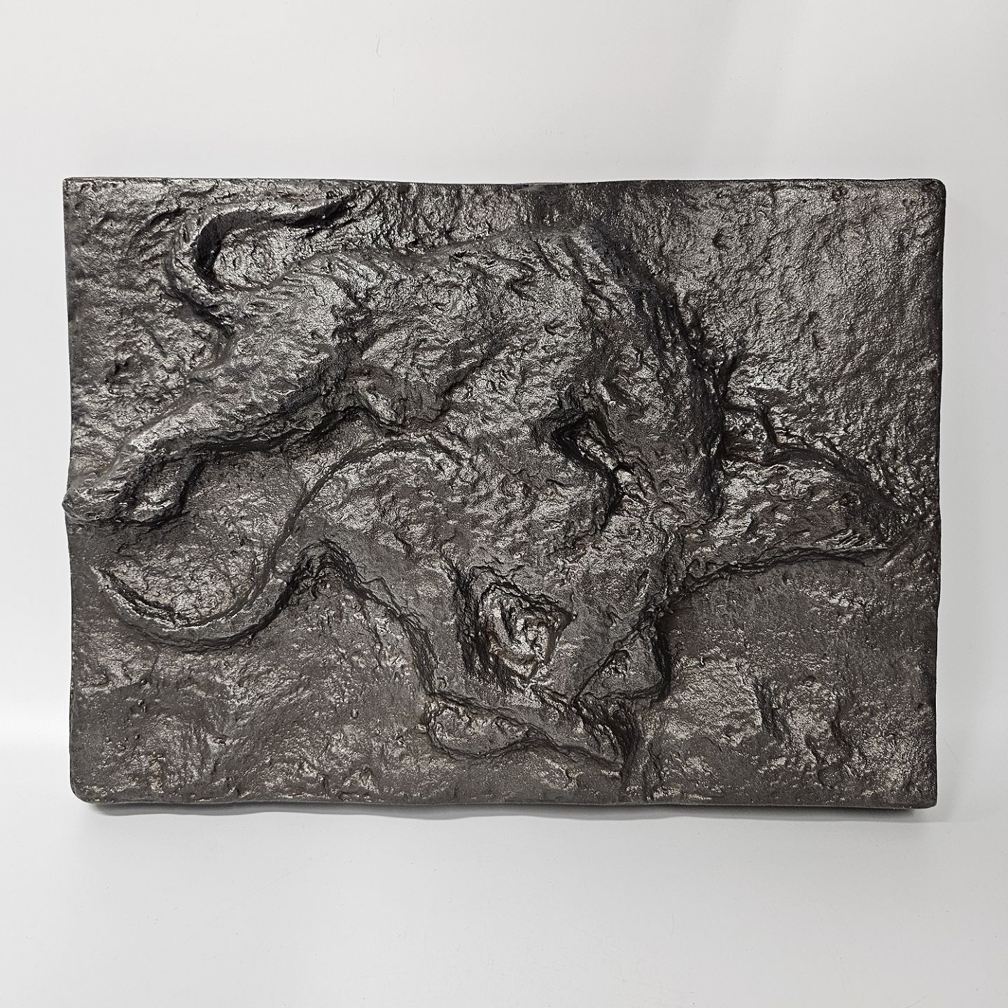 Relief i støbejern med titlen Irske ulvehunde i leg. Dateret 1969