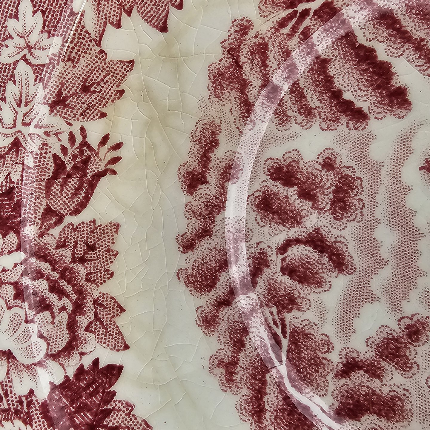Rød Paris er af engelsk fajance dekoreret med forskellige landskaber og blomster i kanten, alt i forskellige røde nuancer