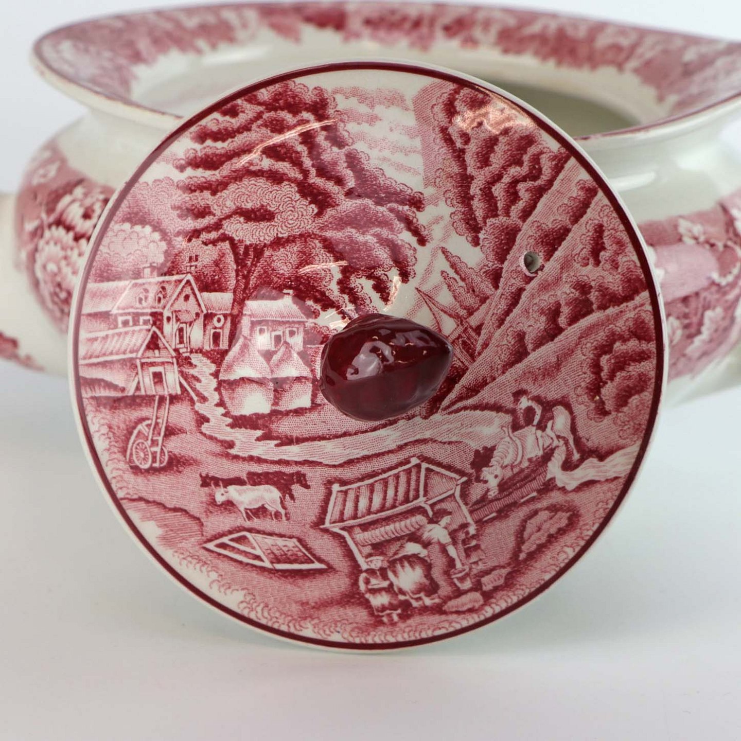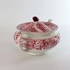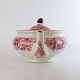 Rød Paris er af engelsk fajance dekoreret med forskellige landskaber og blomster i kanten, alt i forskellige røde nuancer