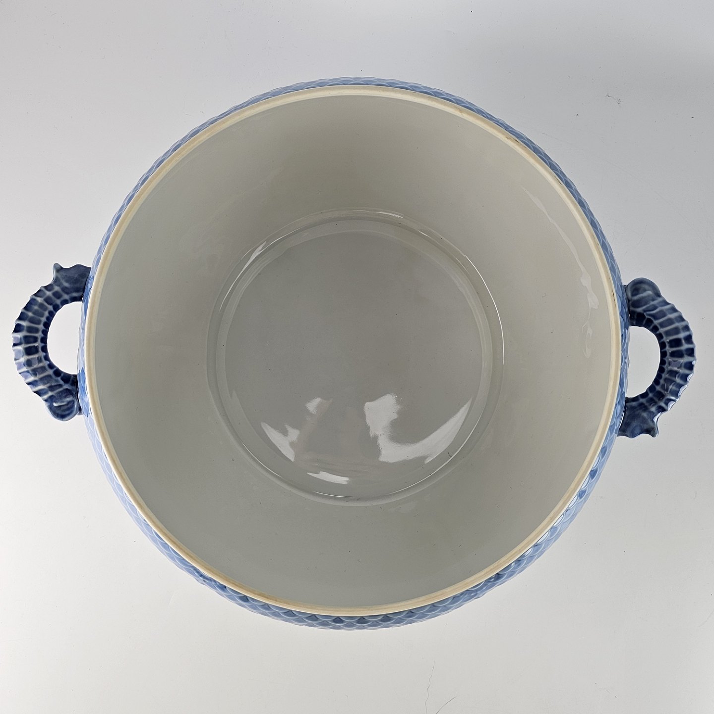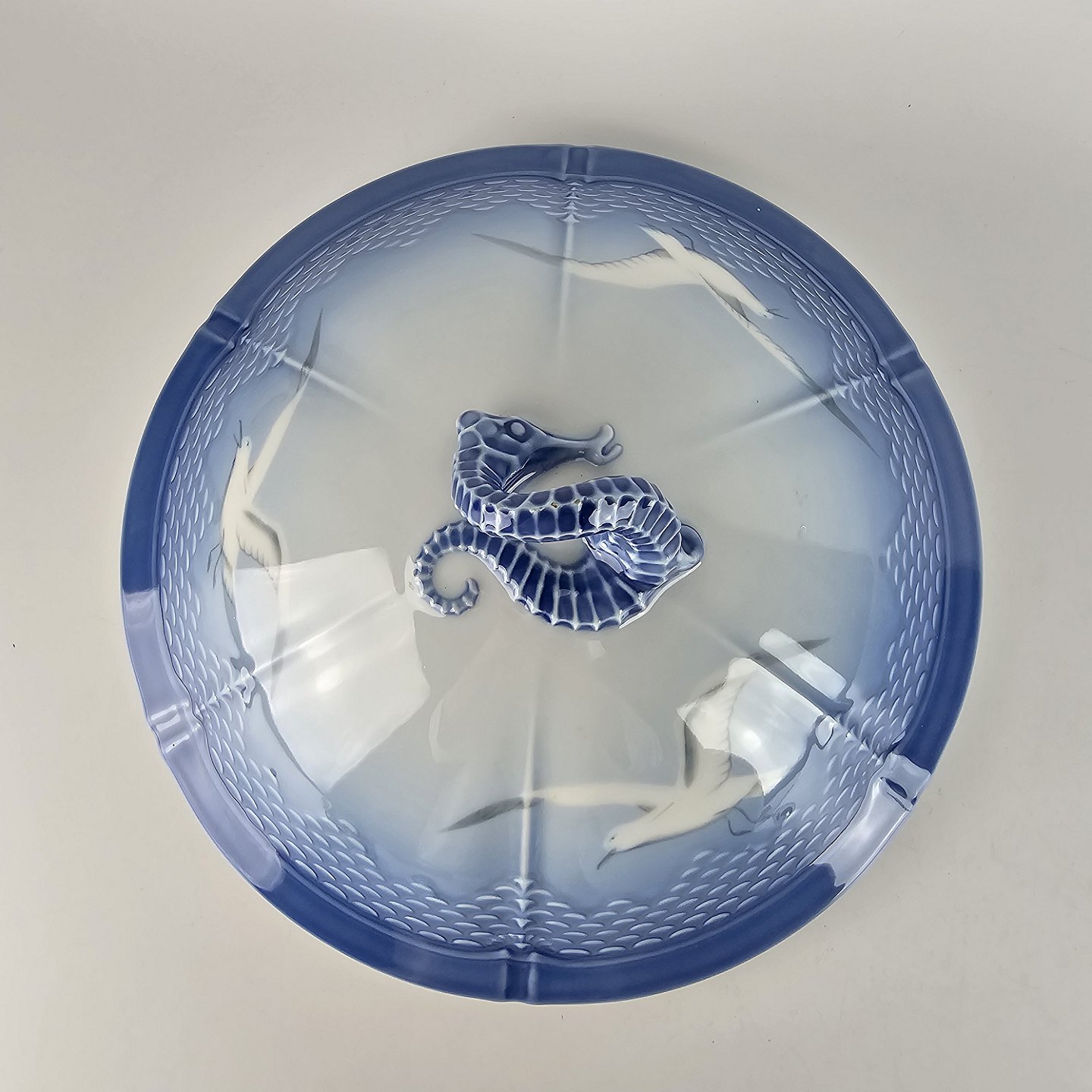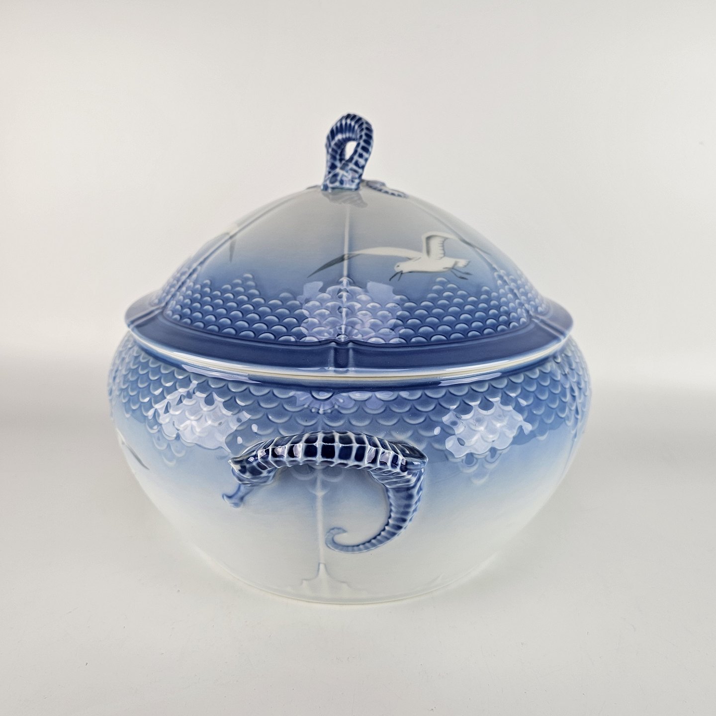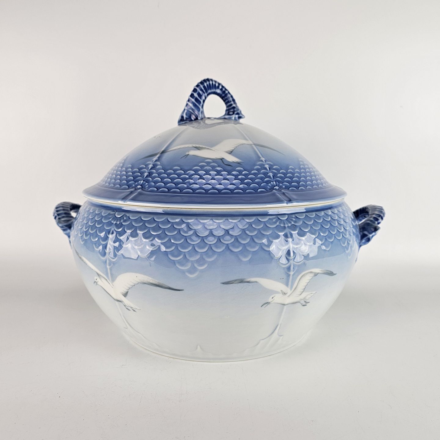 Service i glat porcelæn med skælform i blålige farver og motiv af måger