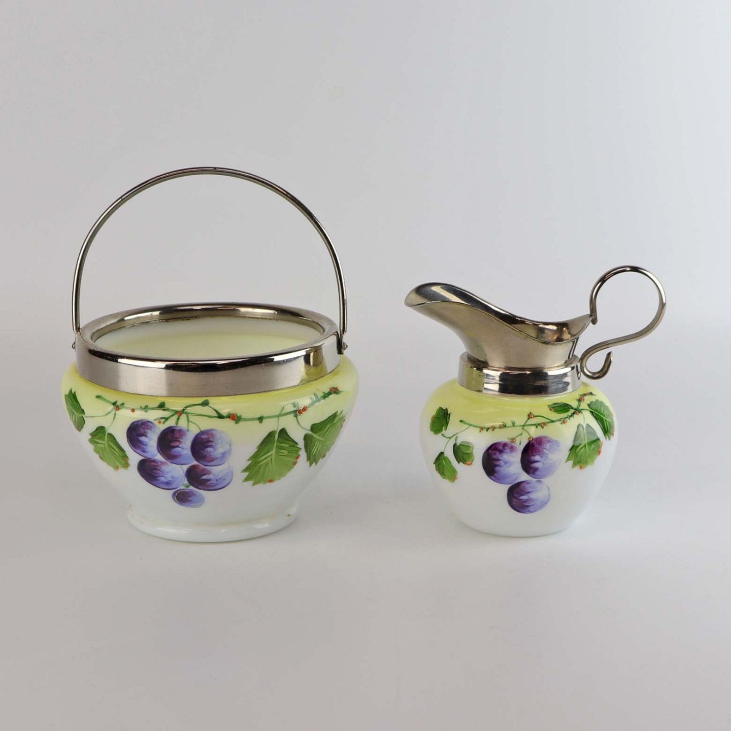 Sukkerskål og flødekande i malet opalineglas med malet motiv af mørklilla vindruesklase. Sættet har monteret hanke af pletsølv.