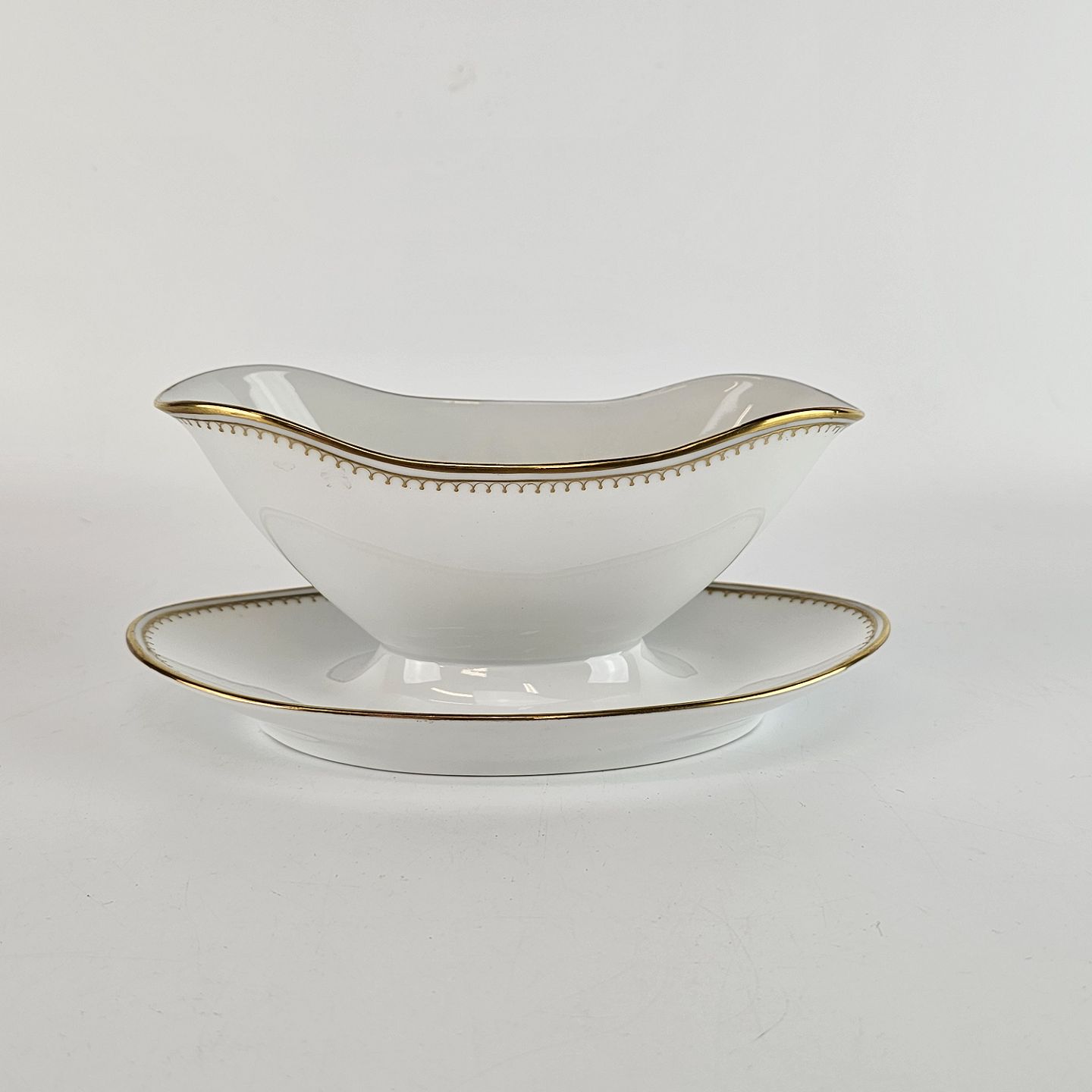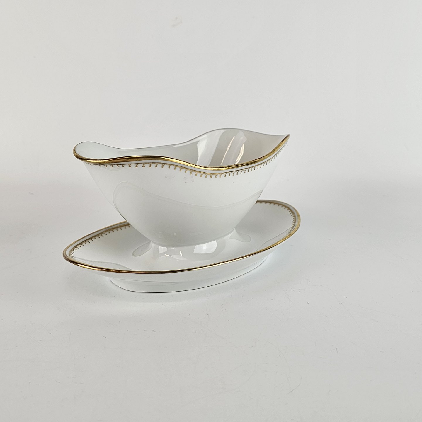 Menuet er hvidt glaseret porcelæn dekoreret med guld i kanten. Lettere brugsspor kan forekomme.