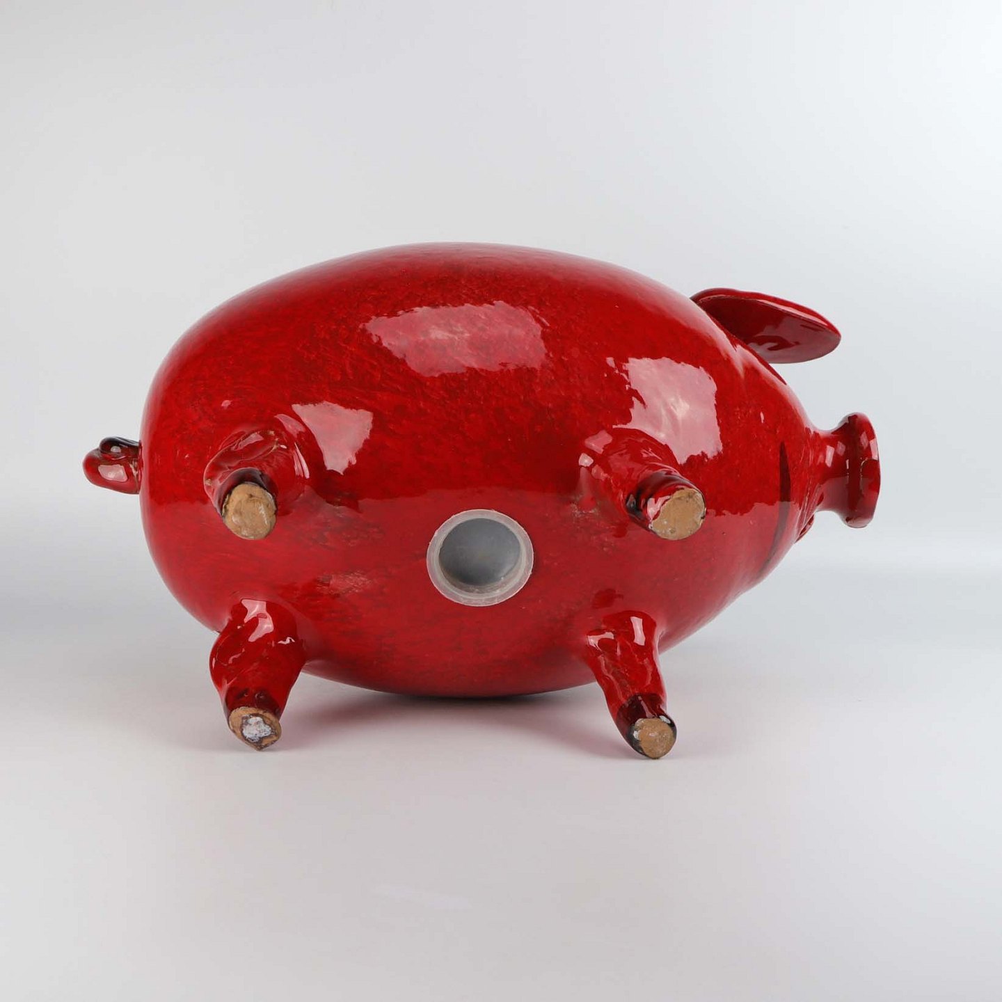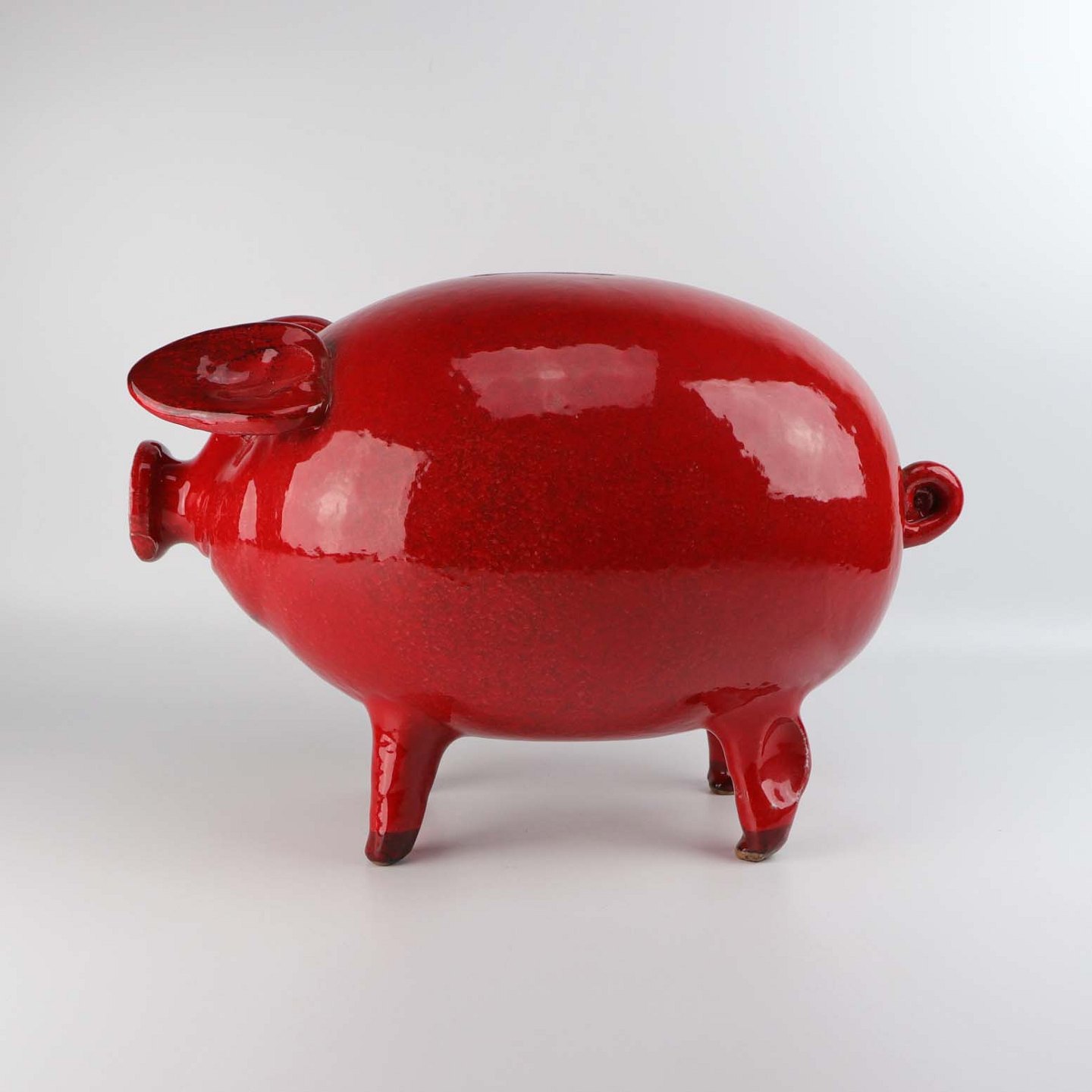 Stor sparegris i rødglaseret keramik og aftagelig bundprop i plast