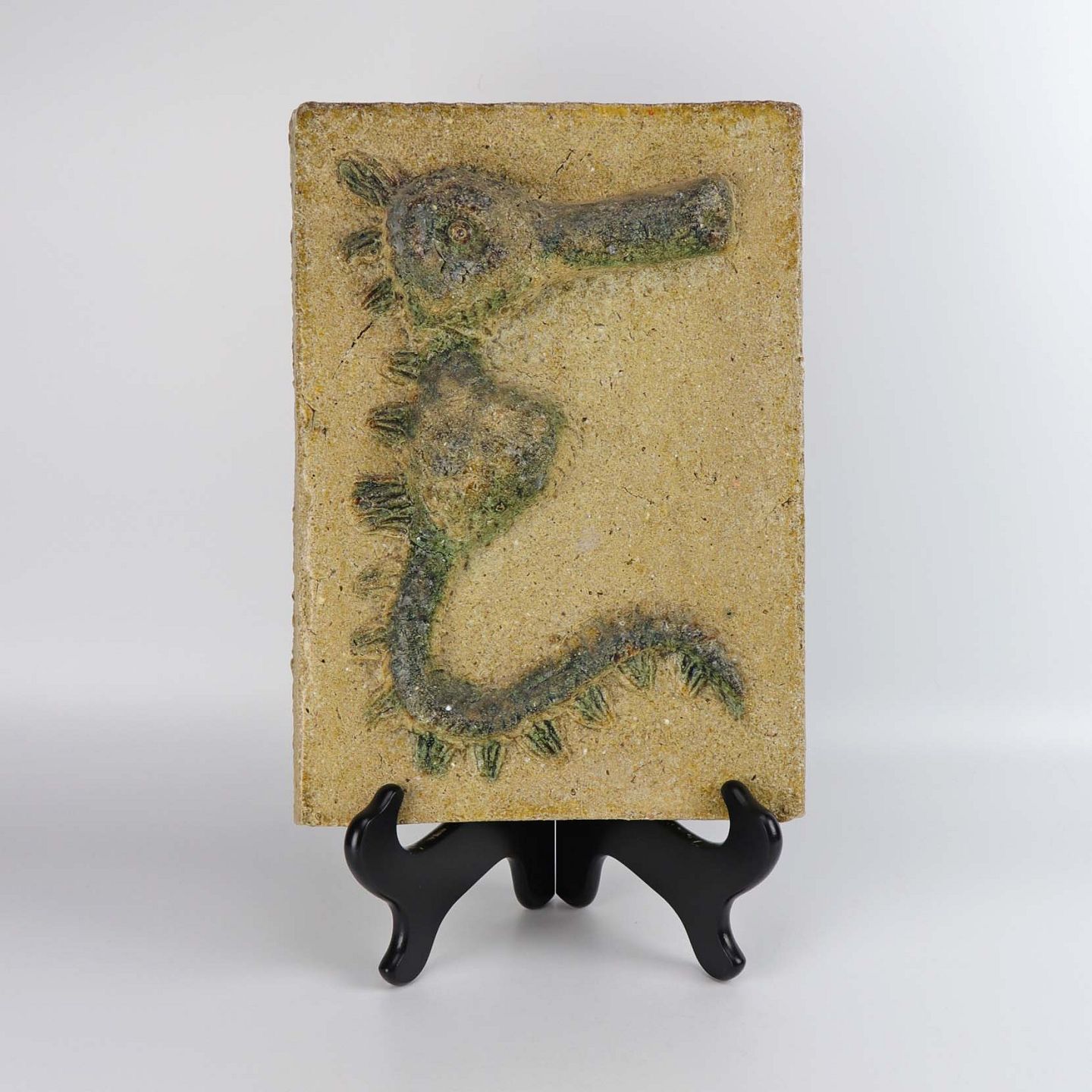 Relief i keramik med motiv af en grønlig søhest på gullig bagrund