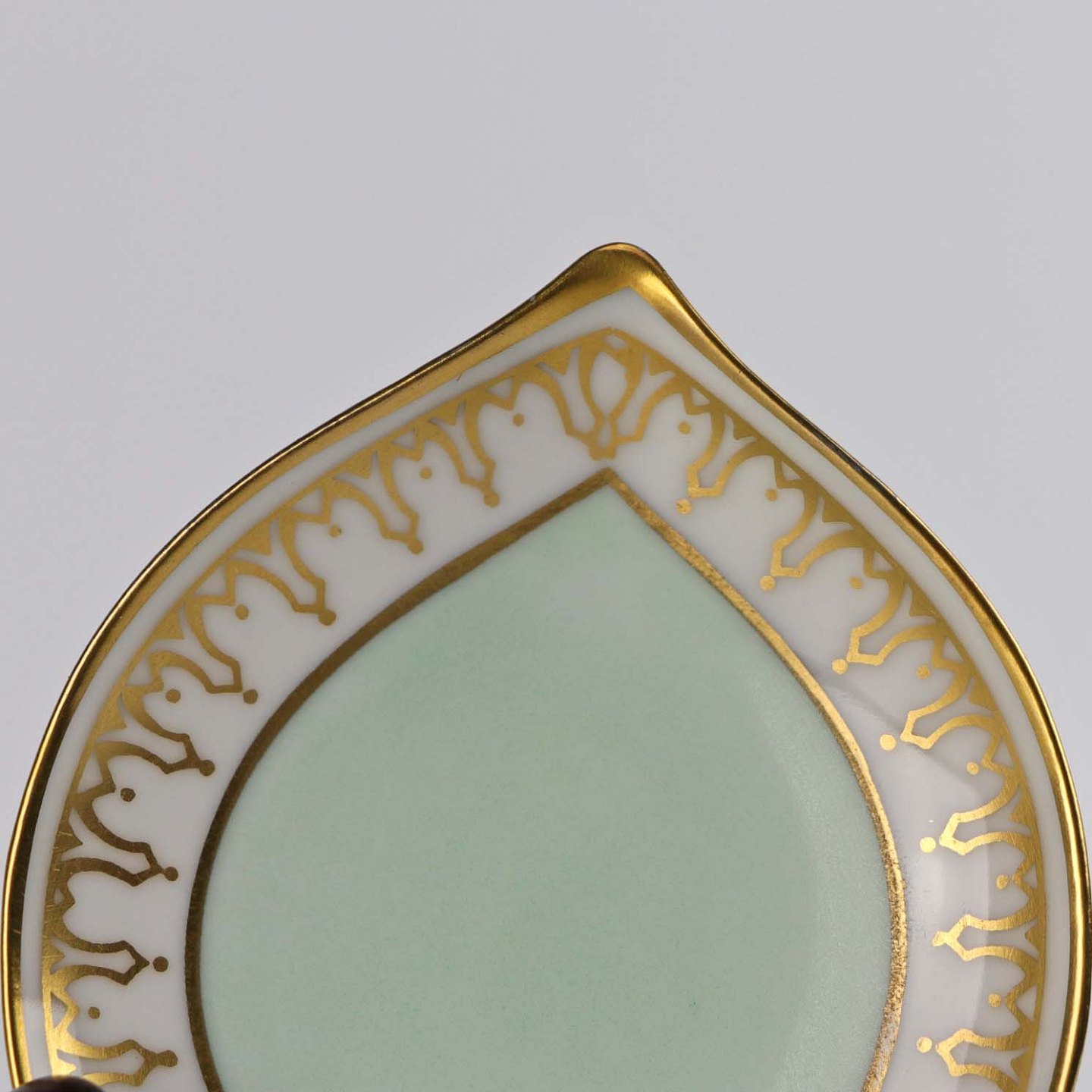 Smørkuvert i glat hvidt porcelæn med lysgrøn bord og forgyldt dekoration