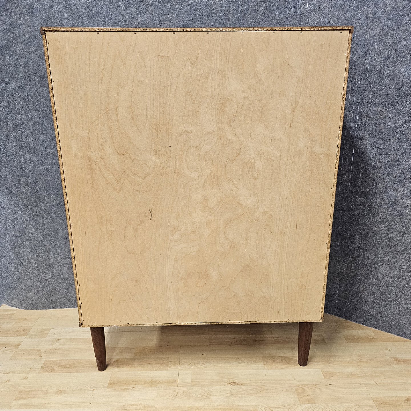 Teak kommode med seks skuffer. Der er fungerende lås og nøgle til øverst skuffe.