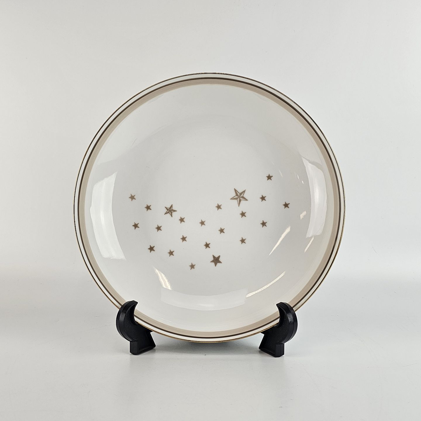 Mælkevejen er af hvidt porcelæn dekoreret med stjerner, en brun ring og guldkanter. Brugsspor kan forekomme
