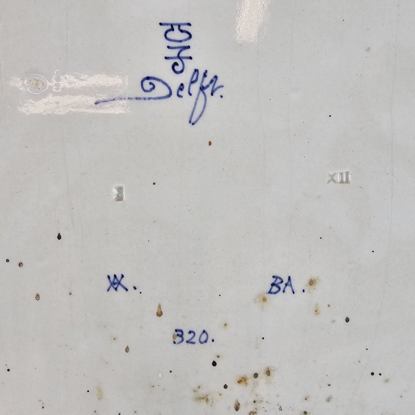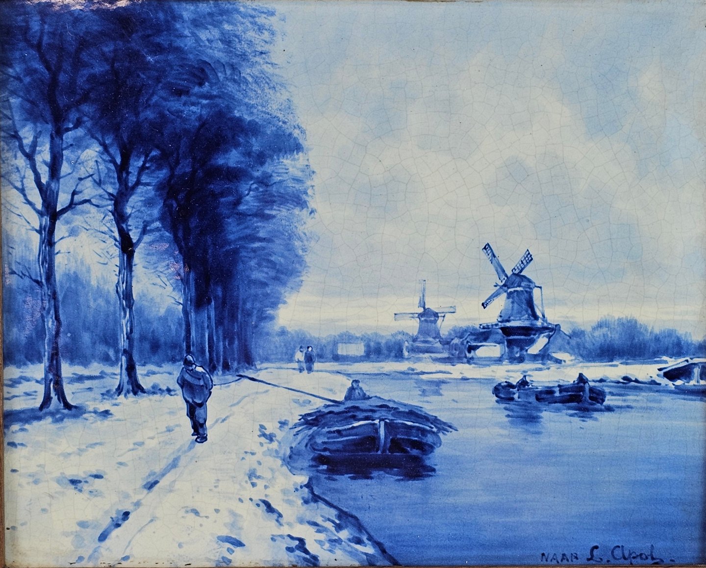 Maleri på flise af fajance i ramme. Fra 1931. Motiv af vandkant, mølle og flodpramme