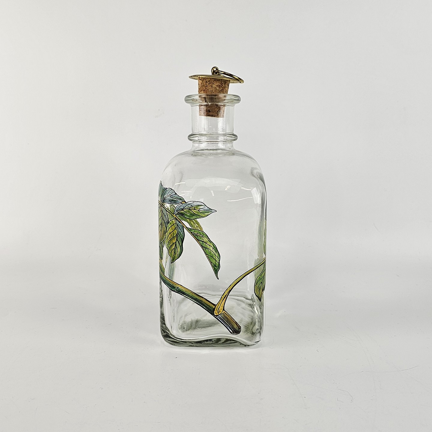 Firkantet glaskaraffel med buet top og tilhørende korkprop. Dekoreret med valnøddegren, der slynger sig om karaflen og teksten Juglans regia L.