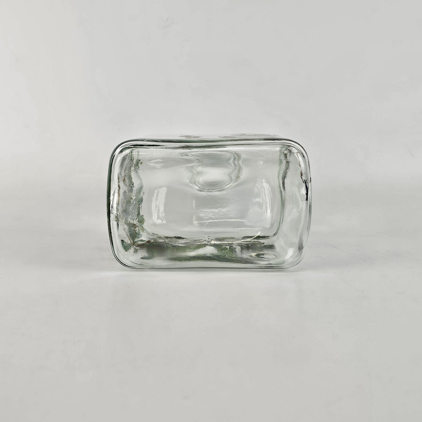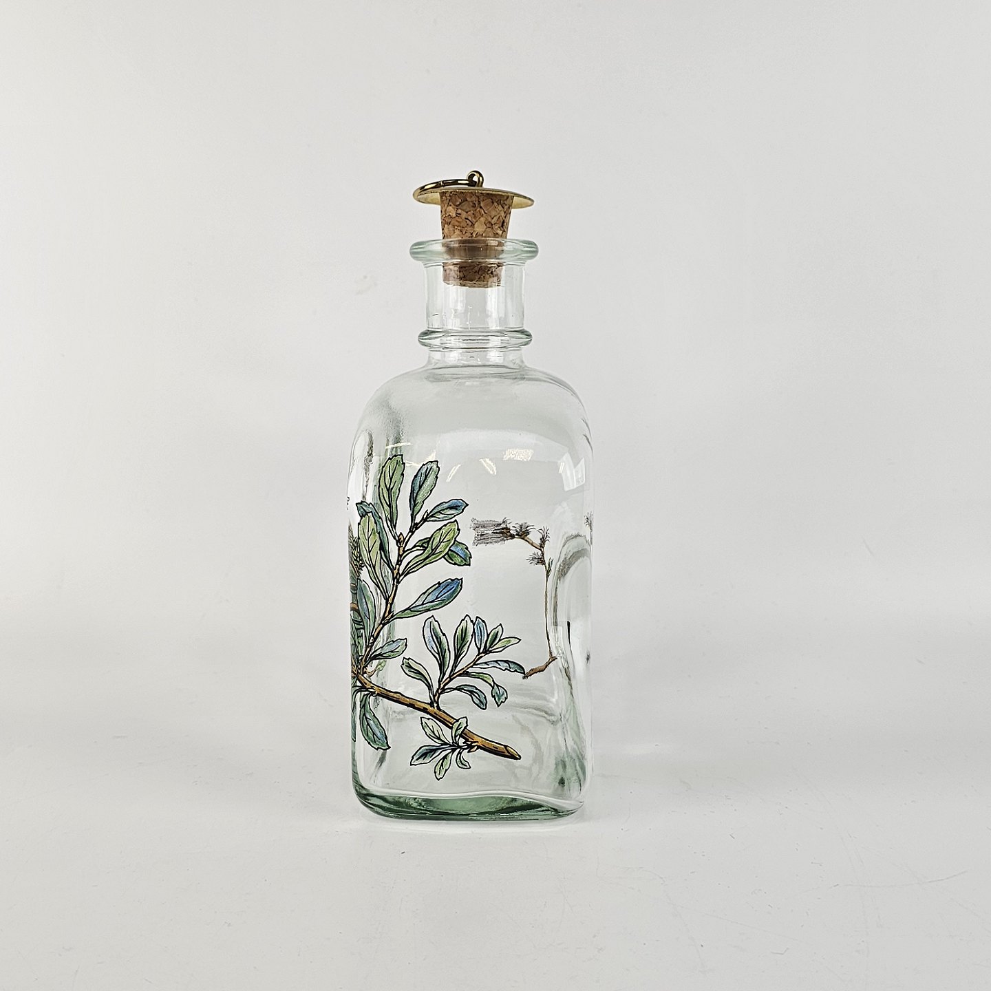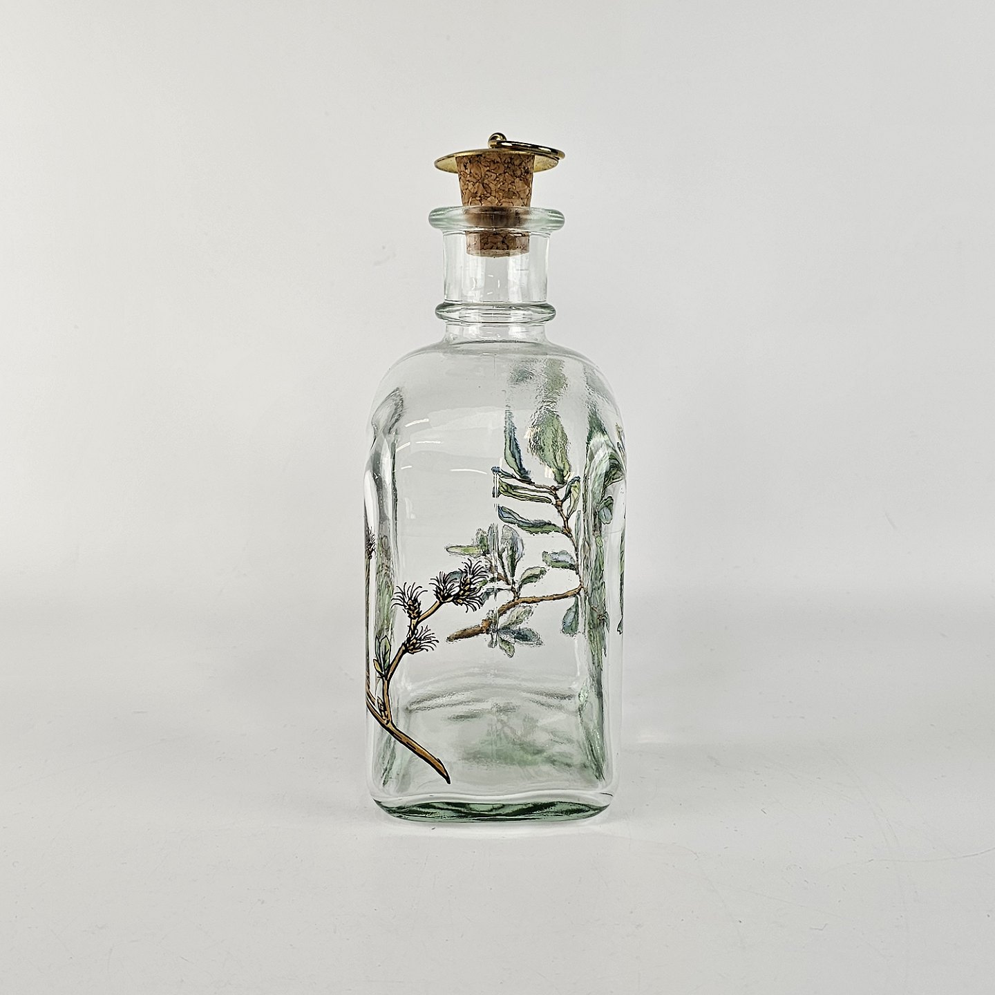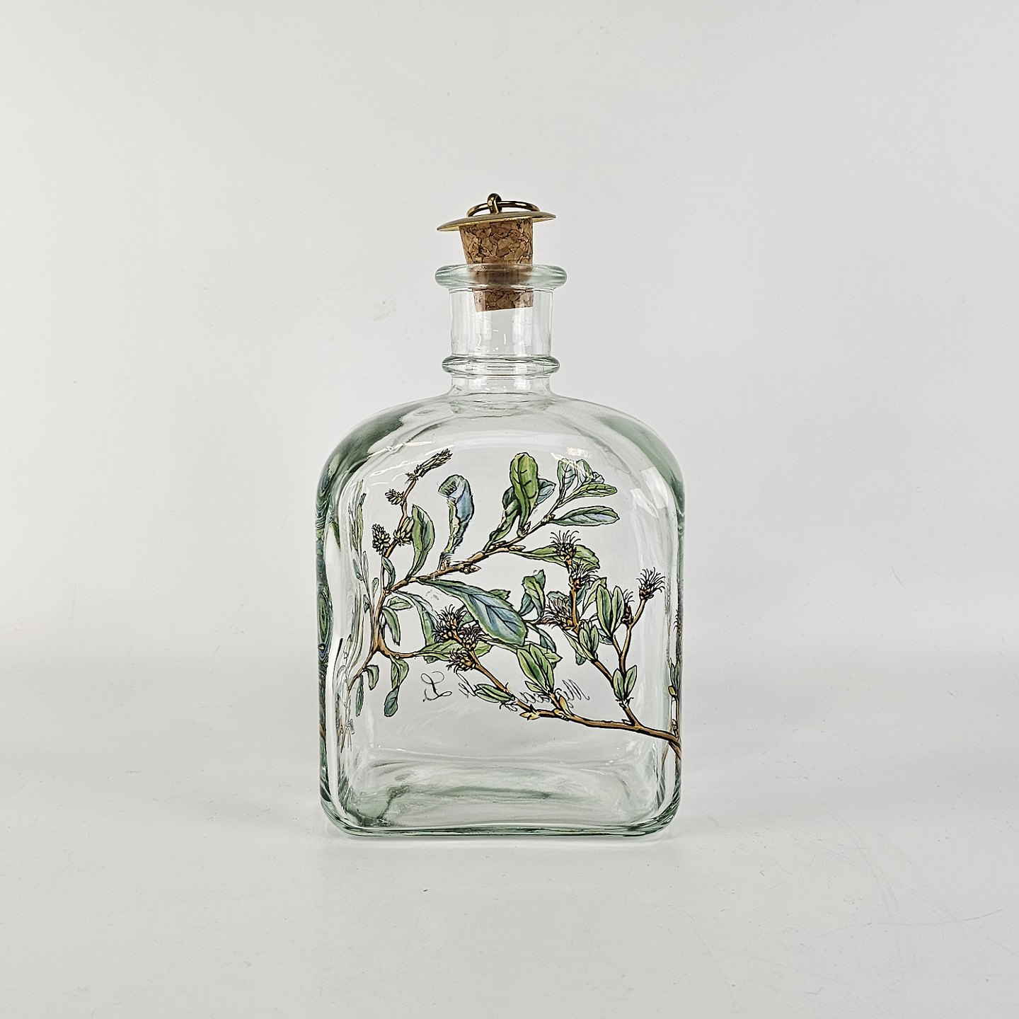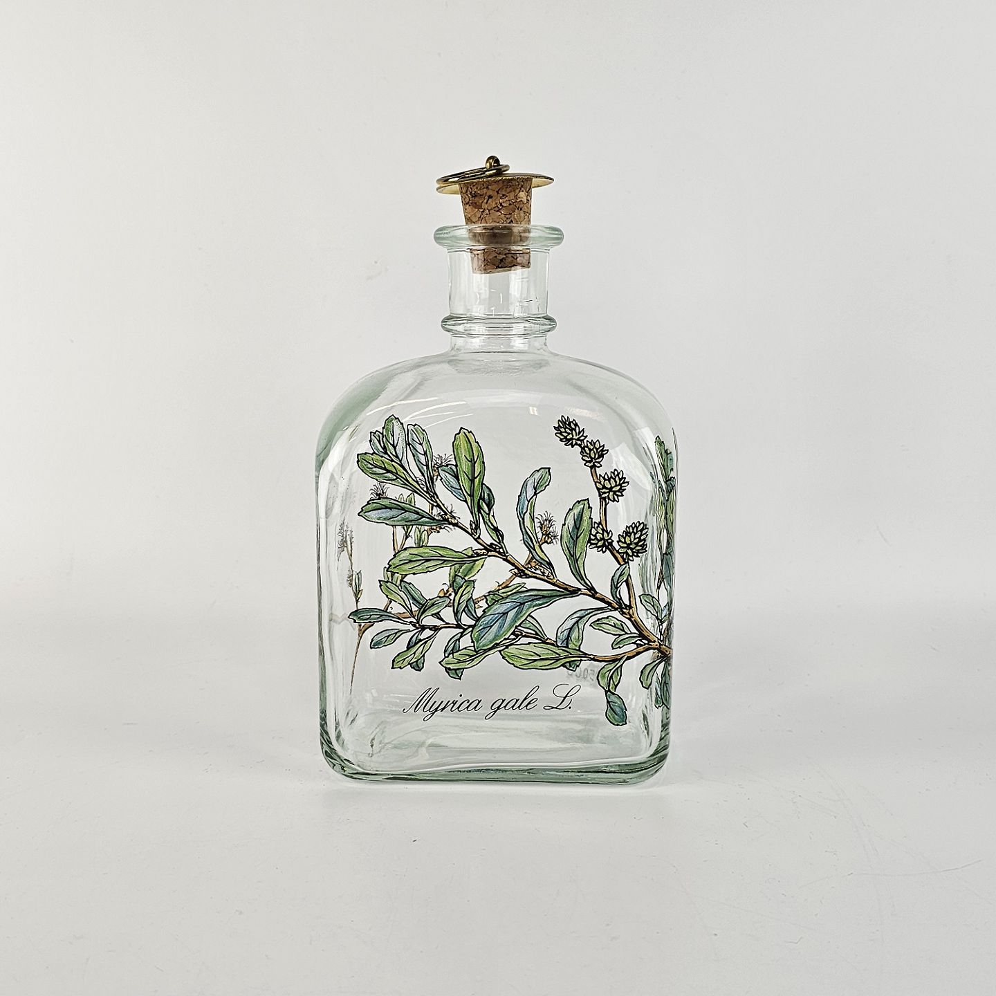 Firkantet karaffel med buet top og tilhørende korkprop. Dekoreret med en gren af mosepors, der slynger sig om karaflen og teksten Myrica gale L