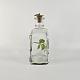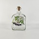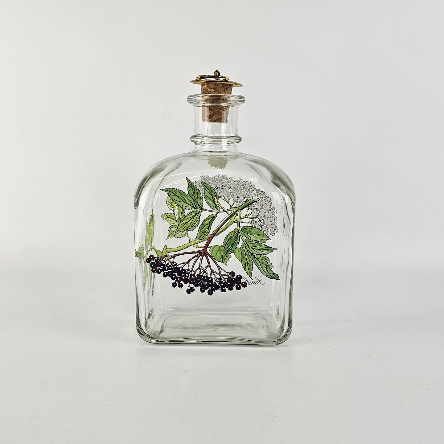 Firkantet karaffel med buet top og tilhørende korkprop. Dekoreret med en gren af hyld, der slynger sig om karaflen og teksten Sambucus Nigra L.