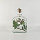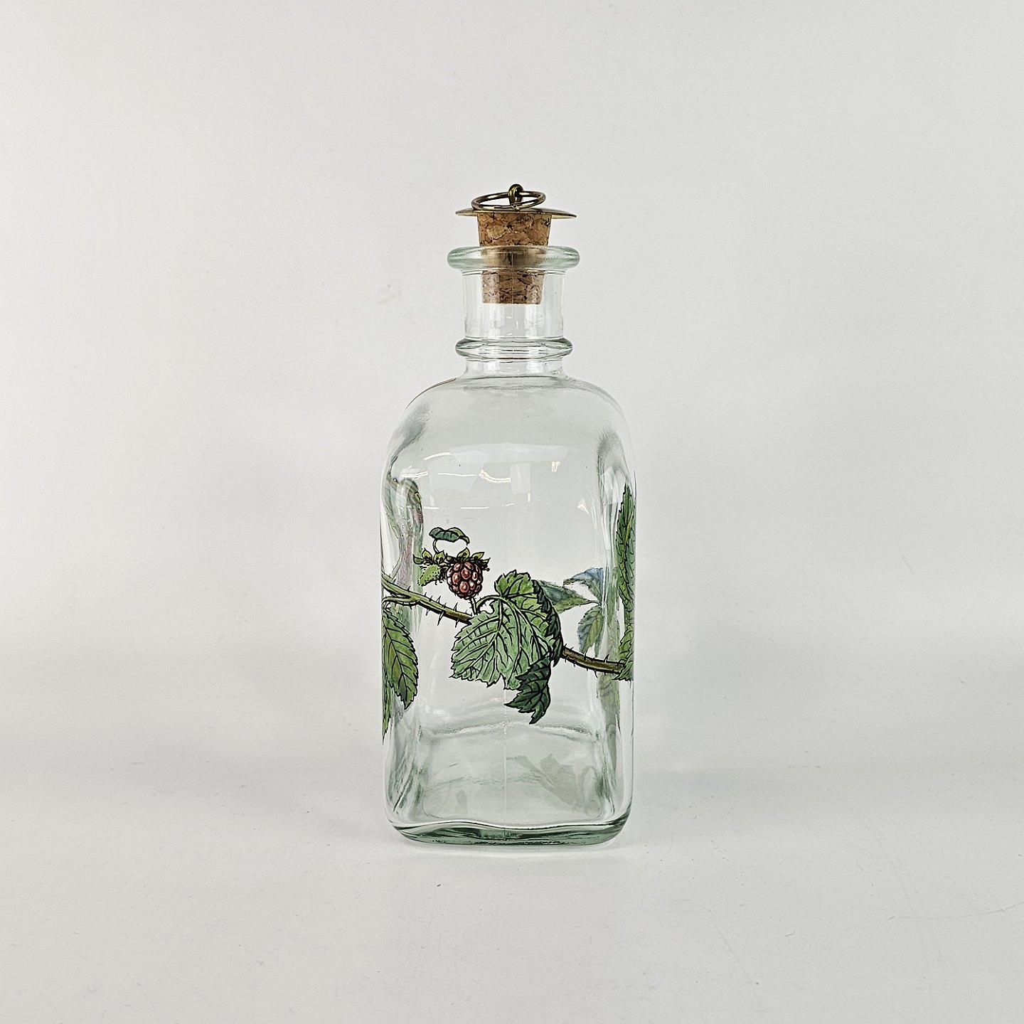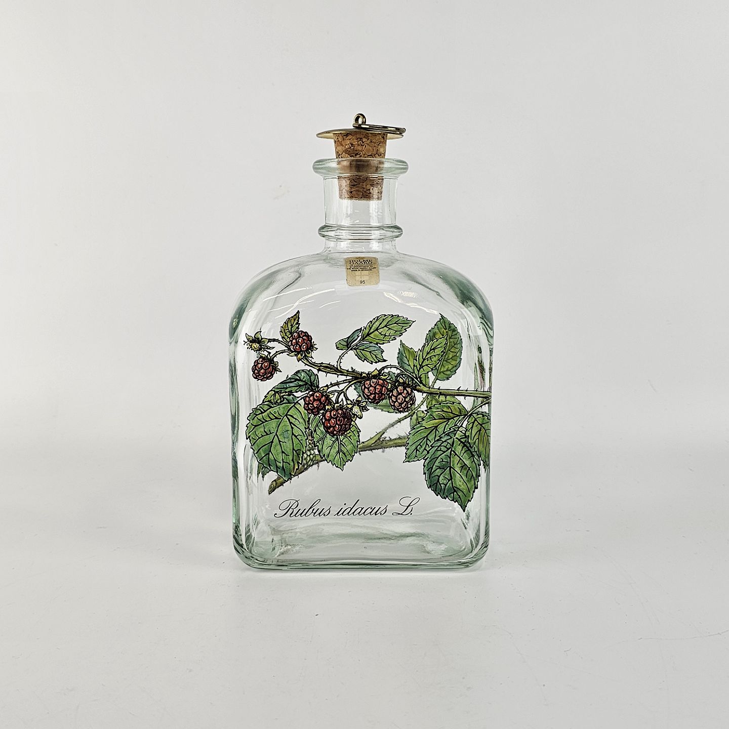 Firkantet karaffel med buet top og tilhørende korkprop. Dekoreret med en gren af hindbær, der slynger sig om karaflen og teksten Rubus idacus L