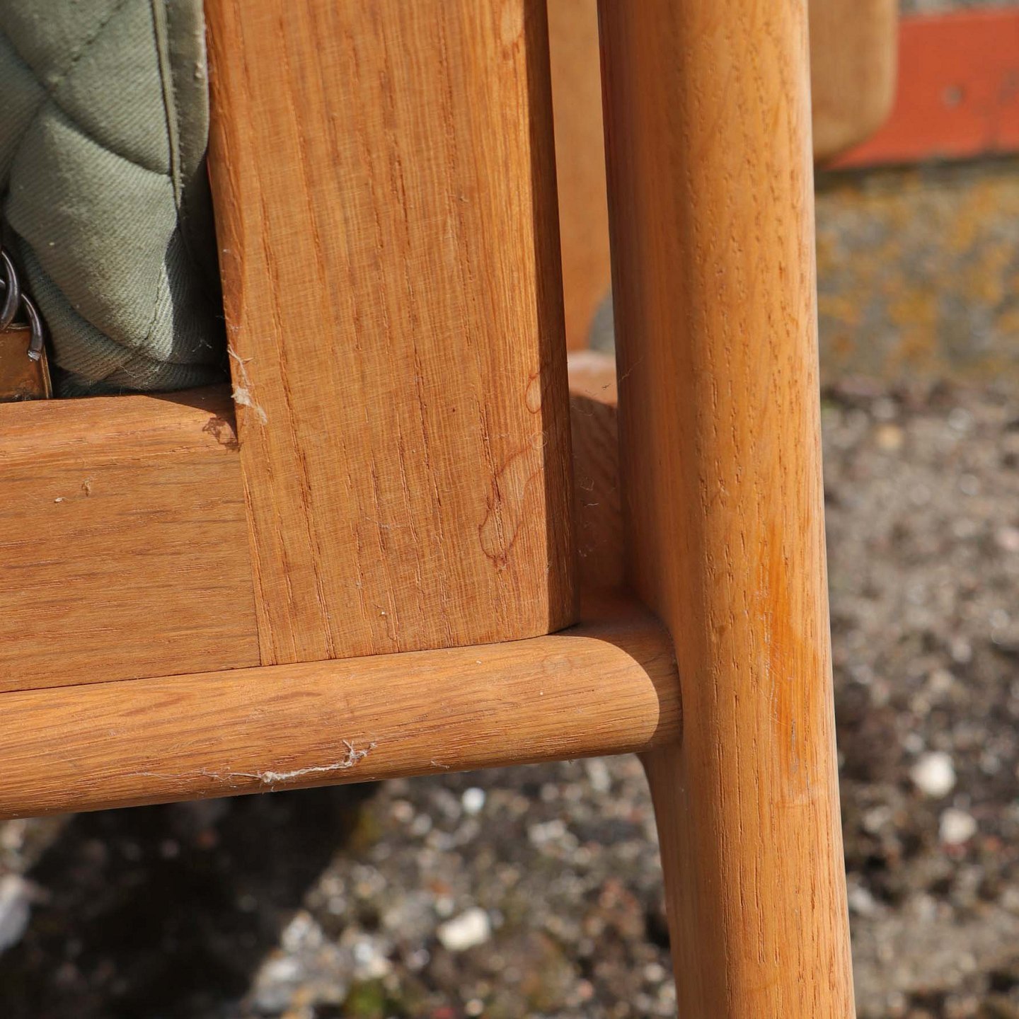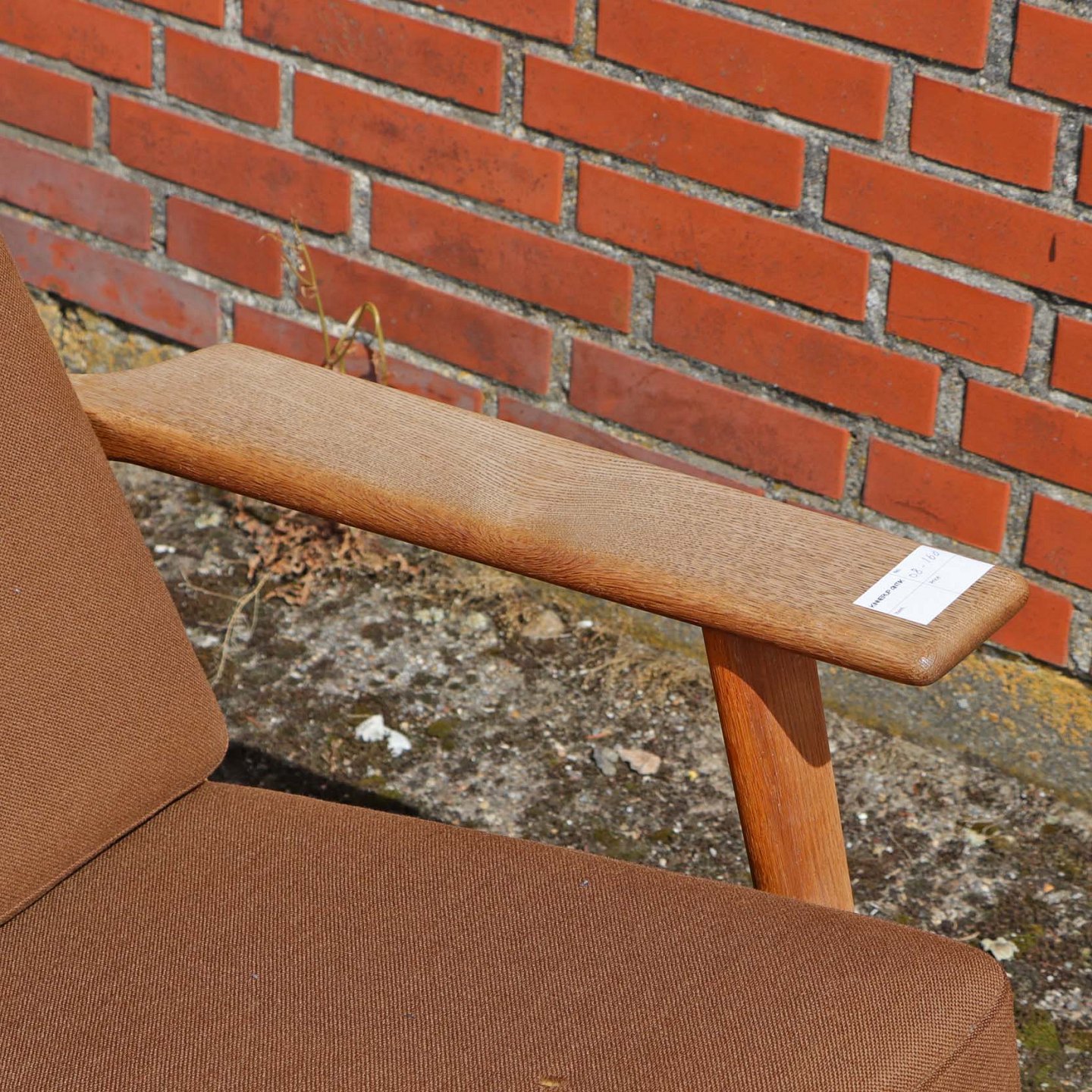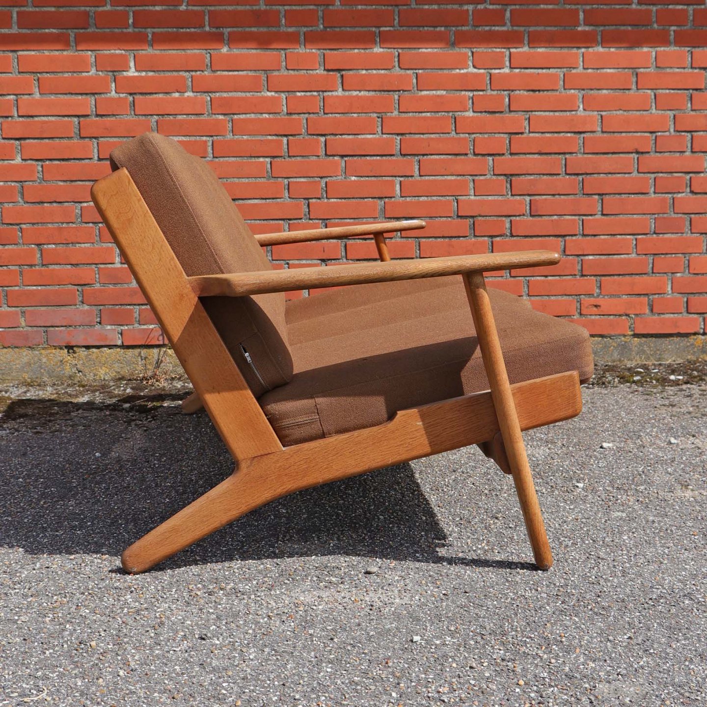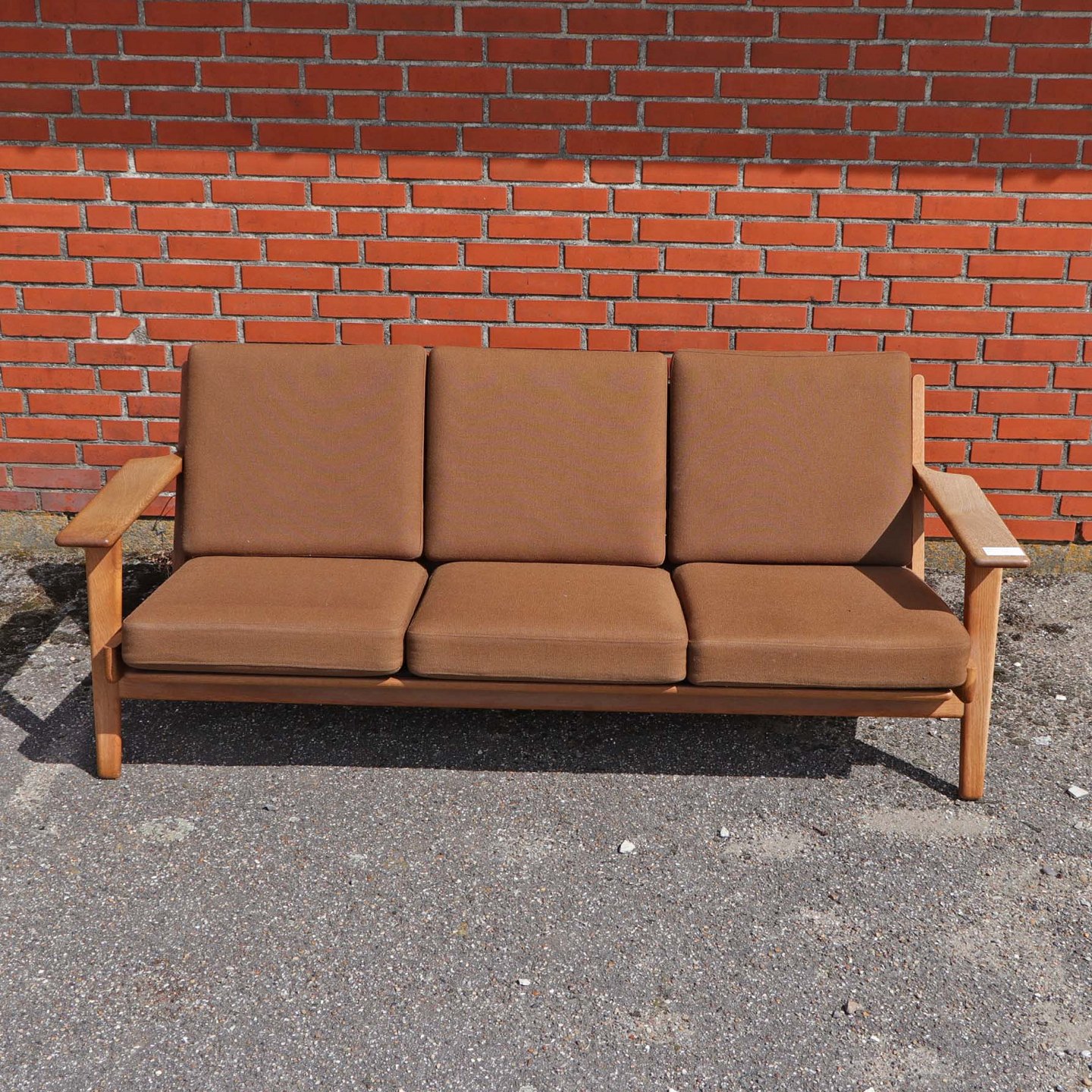 Tre personers sofa model GE290 i egetræ med Springhynder betrukket med brunt uldstof.