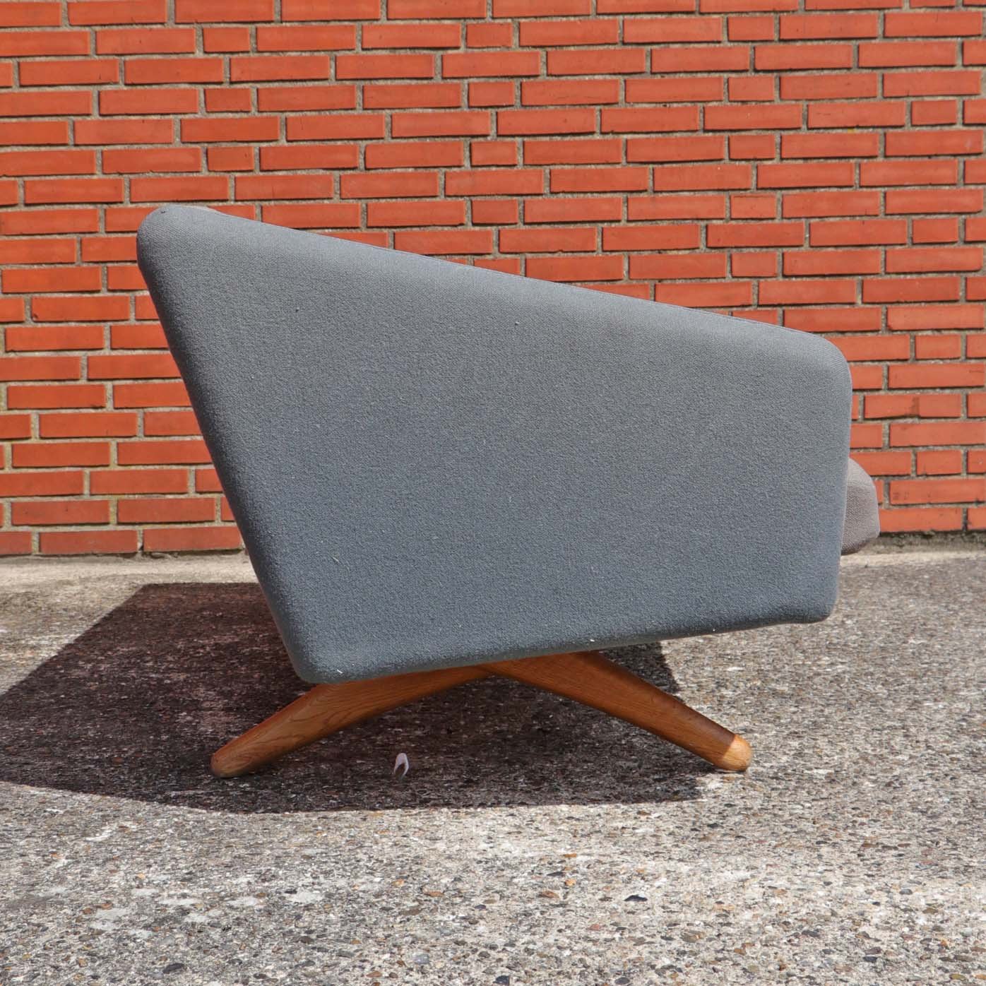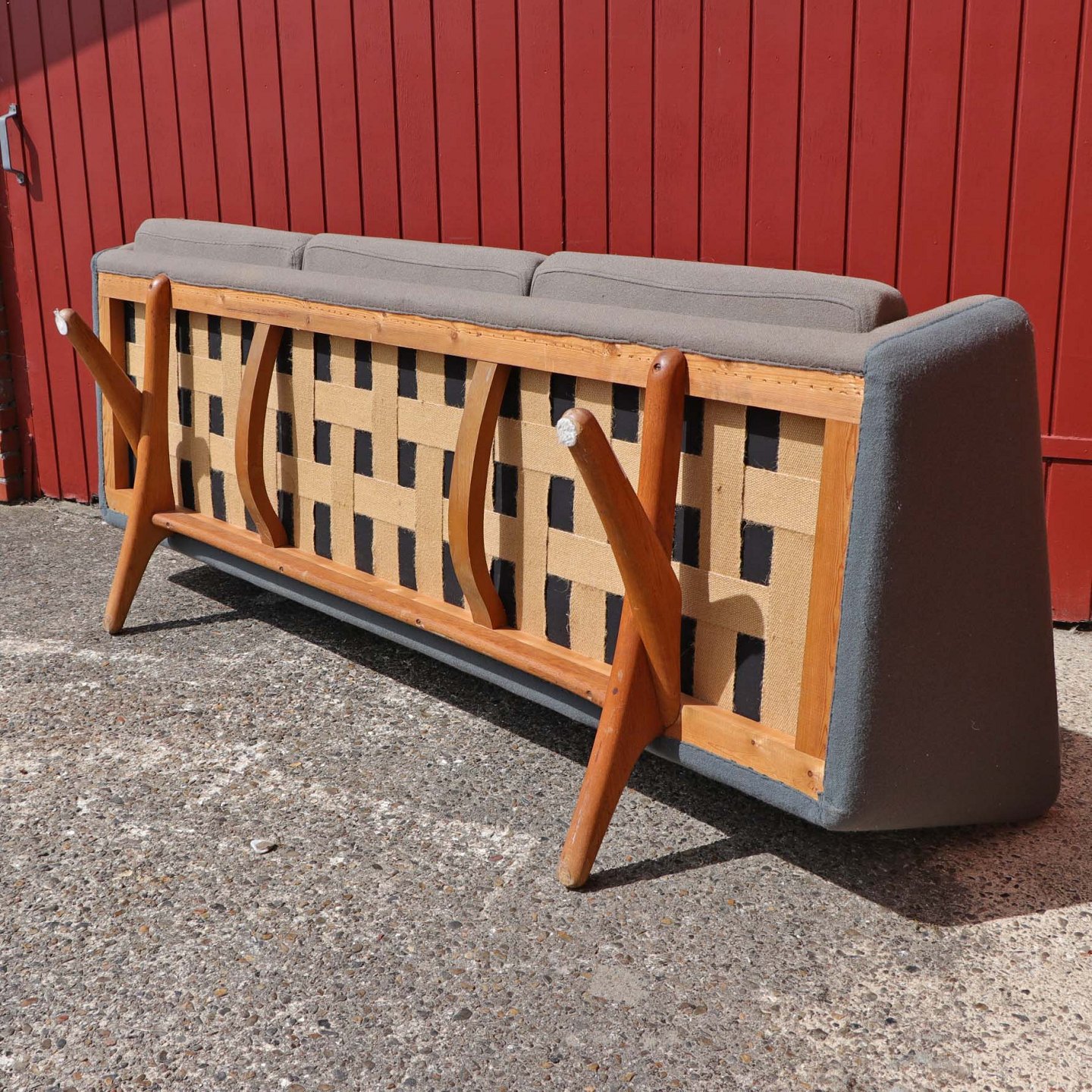 Tre personers sofa model ML90 med stel i lakeret egetræ og betrukket med lys blå og lysegrå uldstof.