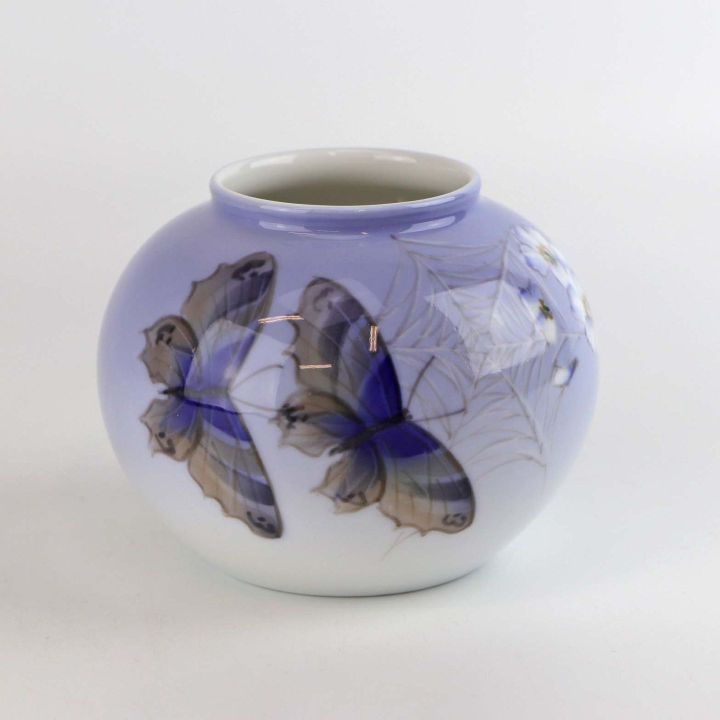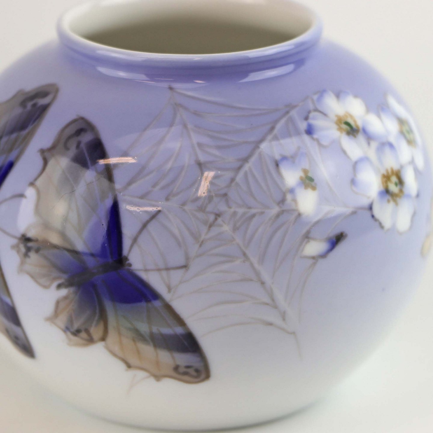 Kongelig kugleformet vase i porcelæn i graduerede blå nuancer med motiv af sommerfugle, edderkoppespind og hvide blomster nr. 814/2390